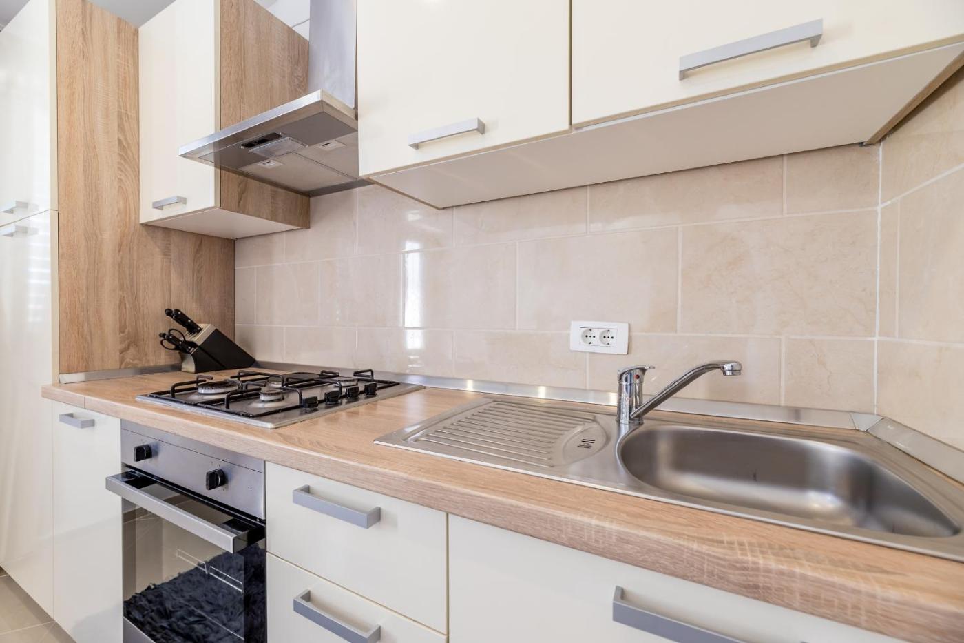 W apartamencie zapewniono kilka sypialni (2), kuchnię z pełnym wyposażeniem, w tym lodówką oraz piekarnikiem, a także łazienkę (1) z prysznicem.