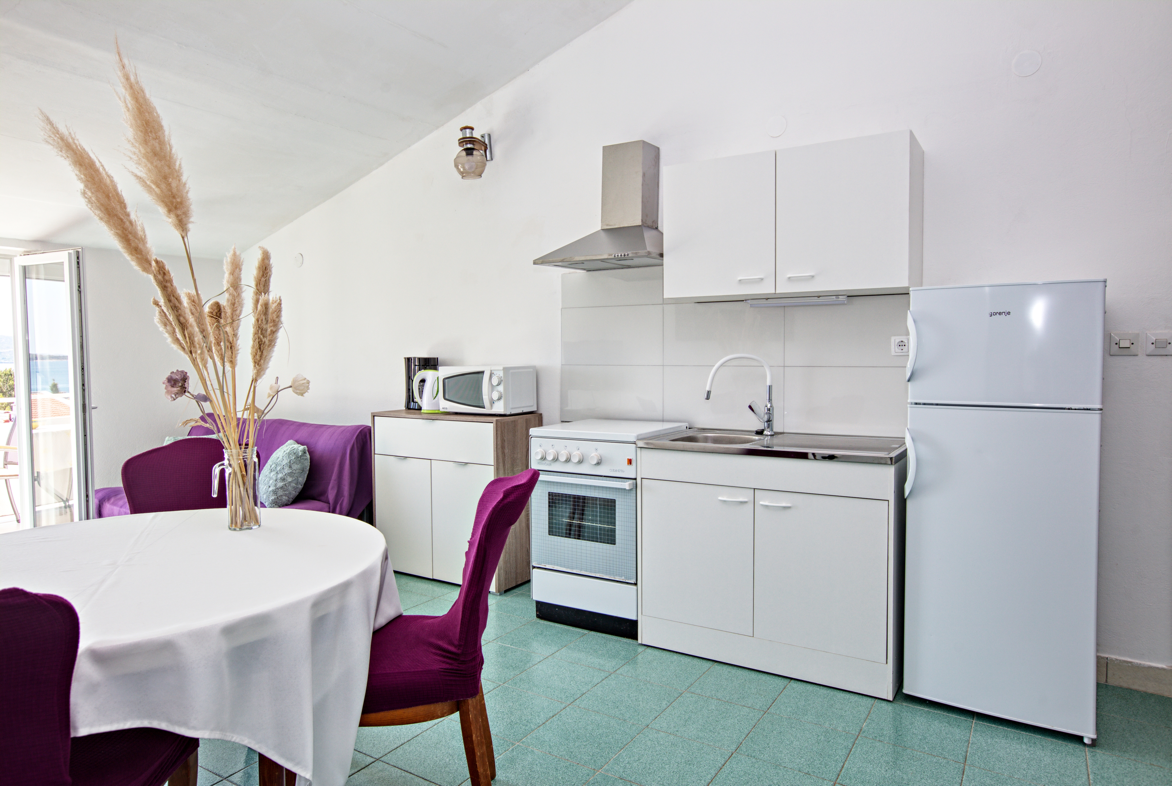 Apartament może przyjąć 5 gości. Łóżka znajdują się w sypialniach, których jest 2, na powierzchni 52m2. Goście mają dostęp do balkonu, by korzystać z ciepłych, letnich wieczorów. Z apartamentu roztacza się widok na morze. Możliwość przygotowywania posiłków poprzez korzystanie ze wspólnego grilla. W kwaterze dozwolony jest pobyt zwierzęcia domowego, za dopłatą. WLICZONE W CENĘ: taksa pobytowa, sprzątanie końcowe, parking, internet. OBOWIĄZKOWE KOSZTY DODATKOWE: dopłata za krótki termin (procent dopłaty w zalezności od liczby noclegów: 30% - 1, 20% - 2, 10% - 3). NIEOBOWIĄZKOWE KOSZTY DODATKOWE: klimatyzacja (10,00 € za nocleg), pranie bielizny (7,00 € pranie), zwierzęta domowe (10,00 € za nocleg). Dostępność dodatkowych usług w rezerwowanym terminie oraz ich cenę (jeśli nie jest podana) należy sprawdzić wcześniej. Za dodatowe usługi, które nie zostały uwzględnione w kalkulacji ceny, płaci się bezpośrednio właścicielowi obiektu, pod warunkiem śe gość korzysta z tych usług. Zniżki od ceny podstawowej: bezpłatny dzień 14=13 (przy pobycie, trwającym co najmniej 14 dni, otrzymujecie jeden bezpłatny dzień na pobyt do 31.12.2026).