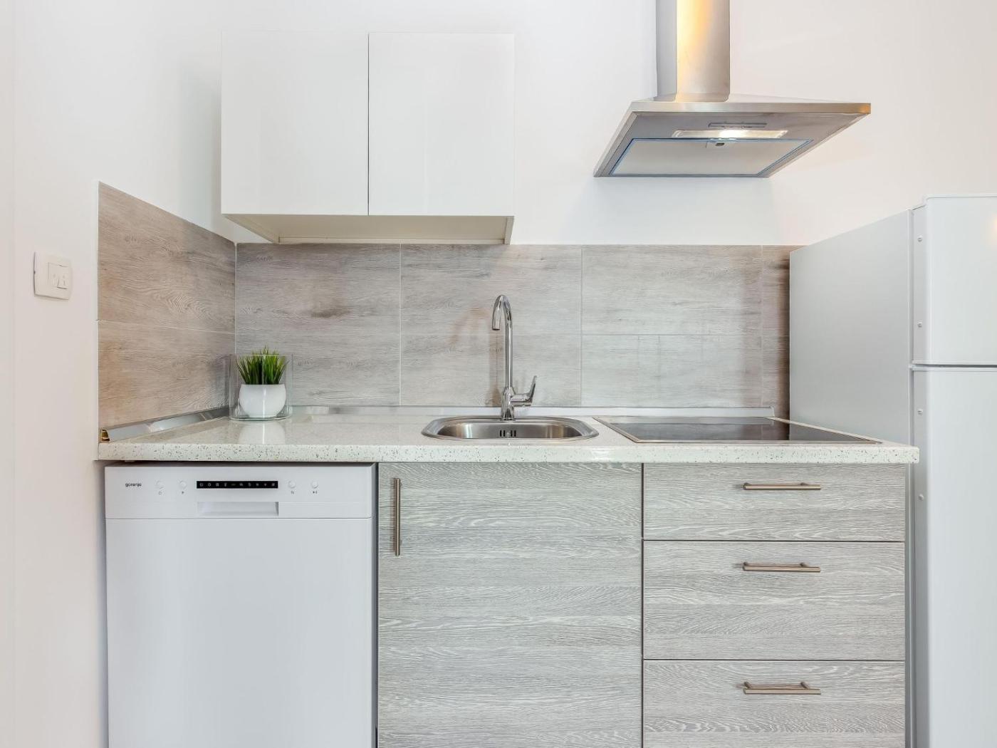 W apartamencie zapewniono sypialnię (1), salon, aneks kuchenny z pełnym wyposażeniem, w tym lodówką i zmywarką, a także łazienkę (1).