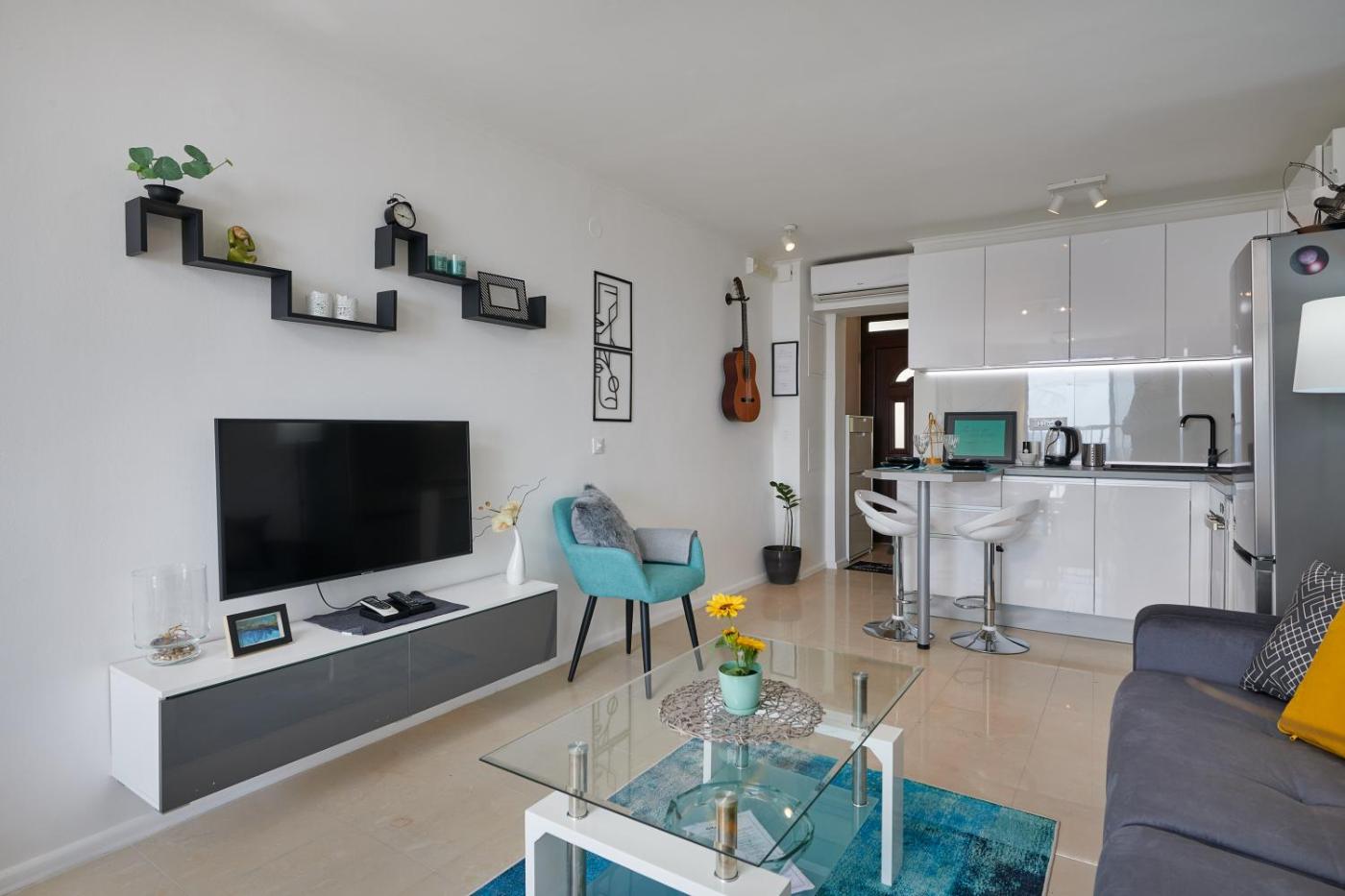 Studio typu Deluxe. The studio offers a dining area, a wardrobe, as well as a private bathroom featuring a shower and a hairdryer. Meals can be prepared in the well-fitted kitchen, which comes with a stovetop, a refrigerator, a dishwasher and kitchenware. The air-conditioned studio provides a flat-screen TV, a washing machine, a private entrance, a seating area as well as sea views. The unit offers 2 beds. Studio - 3 osobowy. Powierzchnia pokoju ok.: 35 mkw.