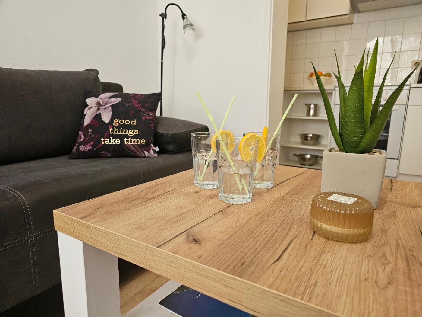 W apartamencie zapewniono sypialnię (1), łazienkę (1), pościel, ręczniki, jadalnię oraz kuchnię z pełnym wyposażeniem. Do dyspozycji Gości jest także telewizor z płaskim ekranem oraz taras z widokiem na miasto.