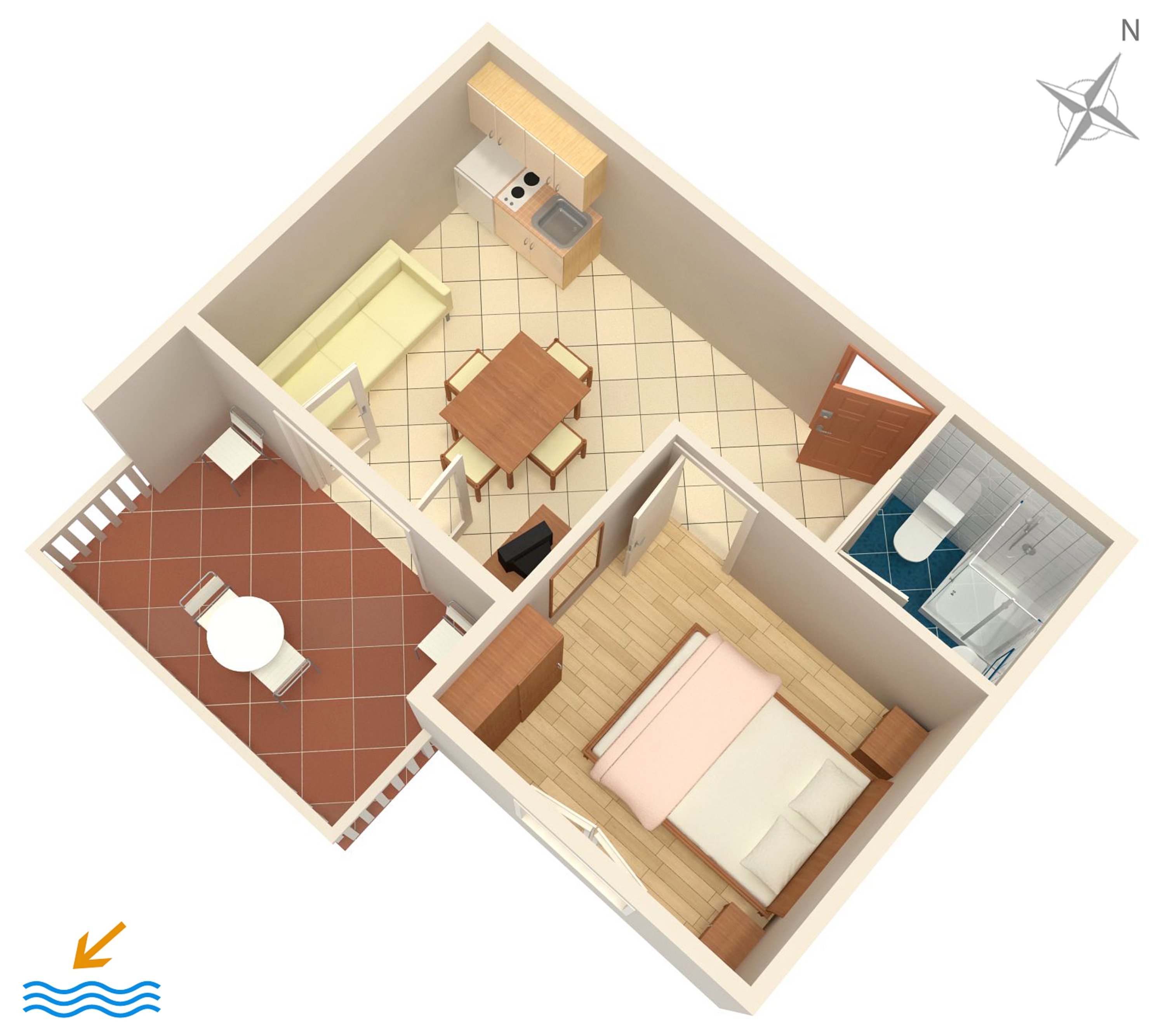 Apartament może przyjąć 3 gości. Łóżka znajdują się w sypialniach, których jest 1, oraz w jadalni, na powierzchni 22m2. Goście mają dostęp do tarasu, by korzystać z ciepłych, letnich wieczorów. Z apartamentu roztacza się widok na morze. Możliwość przygotowywania posiłków poprzez korzystanie ze wspólnego grilla. WLICZONE W CENĘ: taksa pobytowa, sprzątanie końcowe, klimatyzacja, internet, żelazko, deska do prasowania. OBOWIĄZKOWE KOSZTY DODATKOWE: dopłata za krótki termin (procent dopłaty w zalezności od liczby noclegów: 30% - 1, 20% - 2, 10% - 3). Dostępność dodatkowych usług w rezerwowanym terminie oraz ich cenę (jeśli nie jest podana) należy sprawdzić wcześniej. Za dodatowe usługi, które nie zostały uwzględnione w kalkulacji ceny, płaci się bezpośrednio właścicielowi obiektu, pod warunkiem śe gość korzysta z tych usług. Zniżki od ceny podstawowej: bezpłatny dzień 14=13 (przy pobycie, trwającym co najmniej 14 dni, otrzymujecie jeden bezpłatny dzień na pobyt do 31.12.2026).
