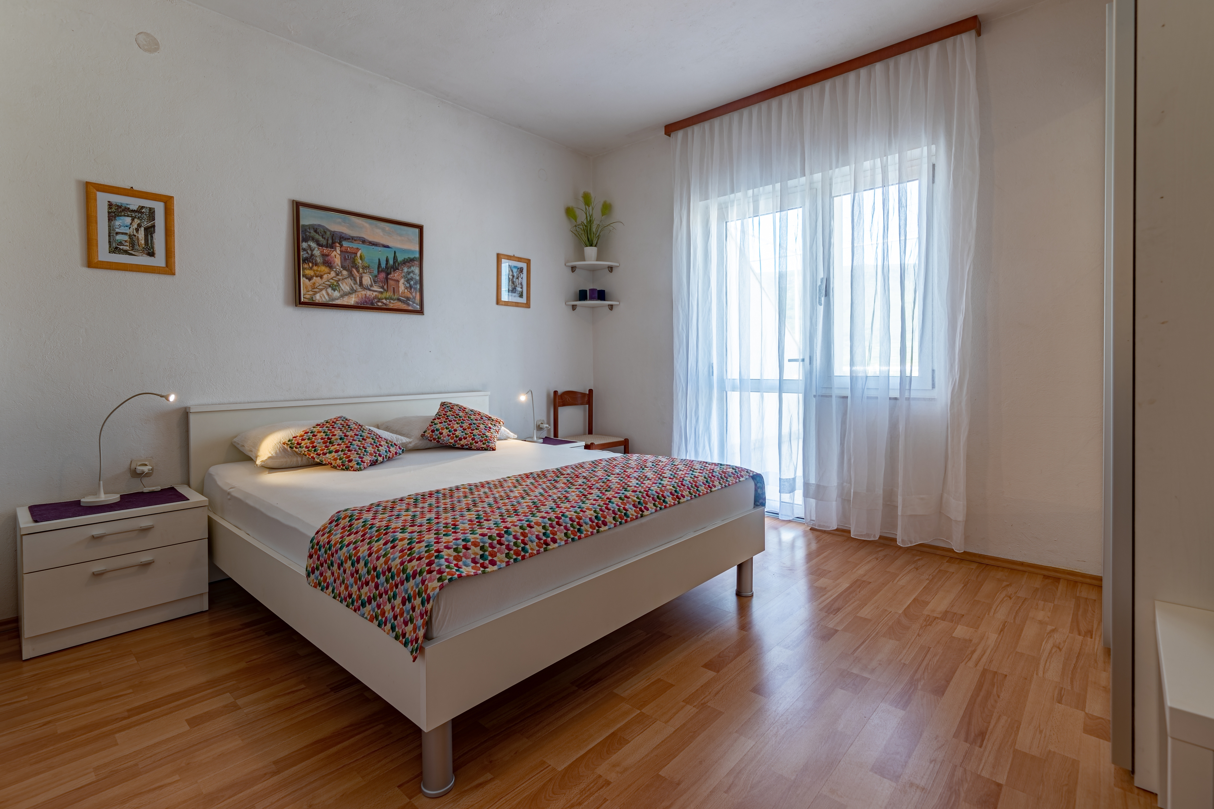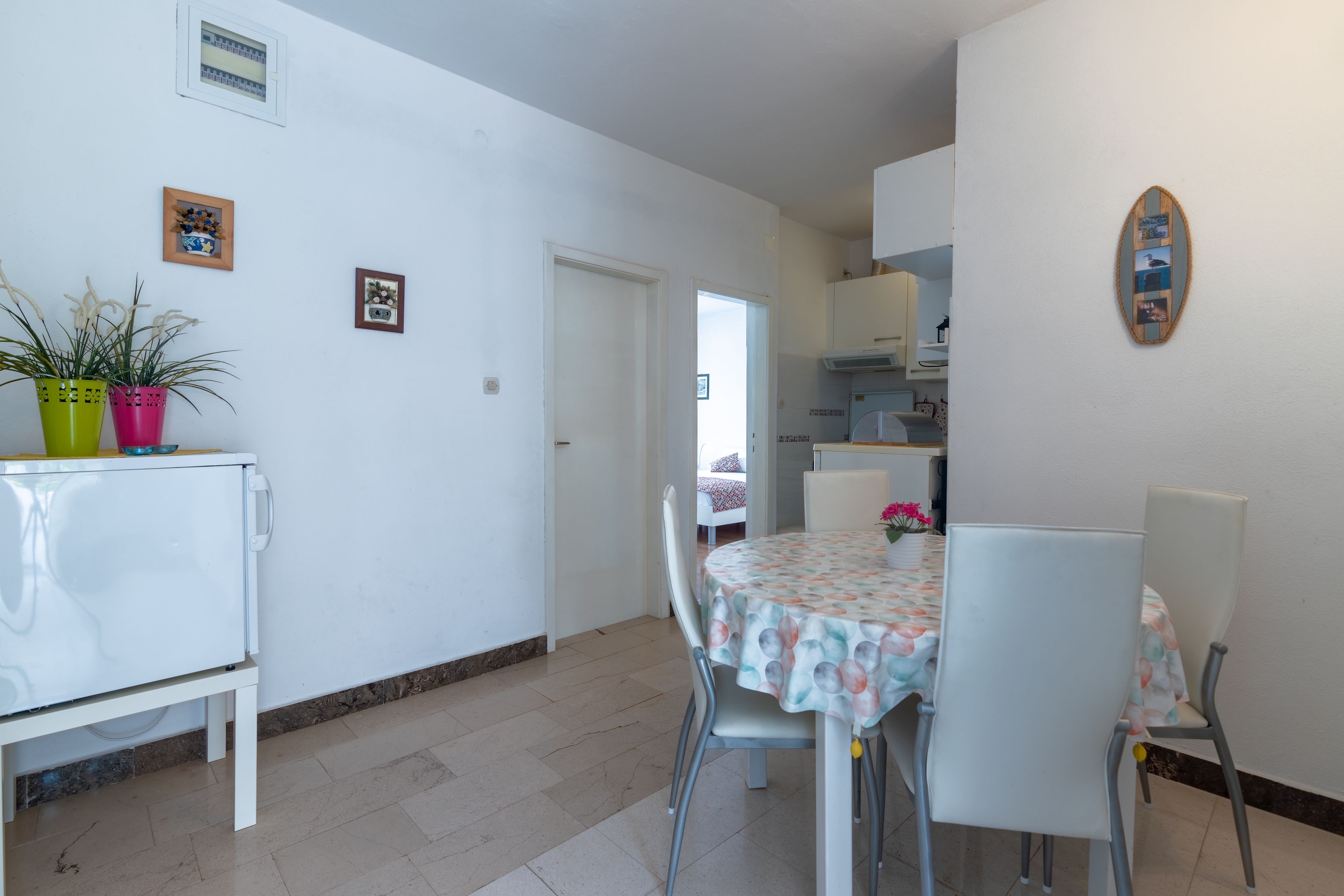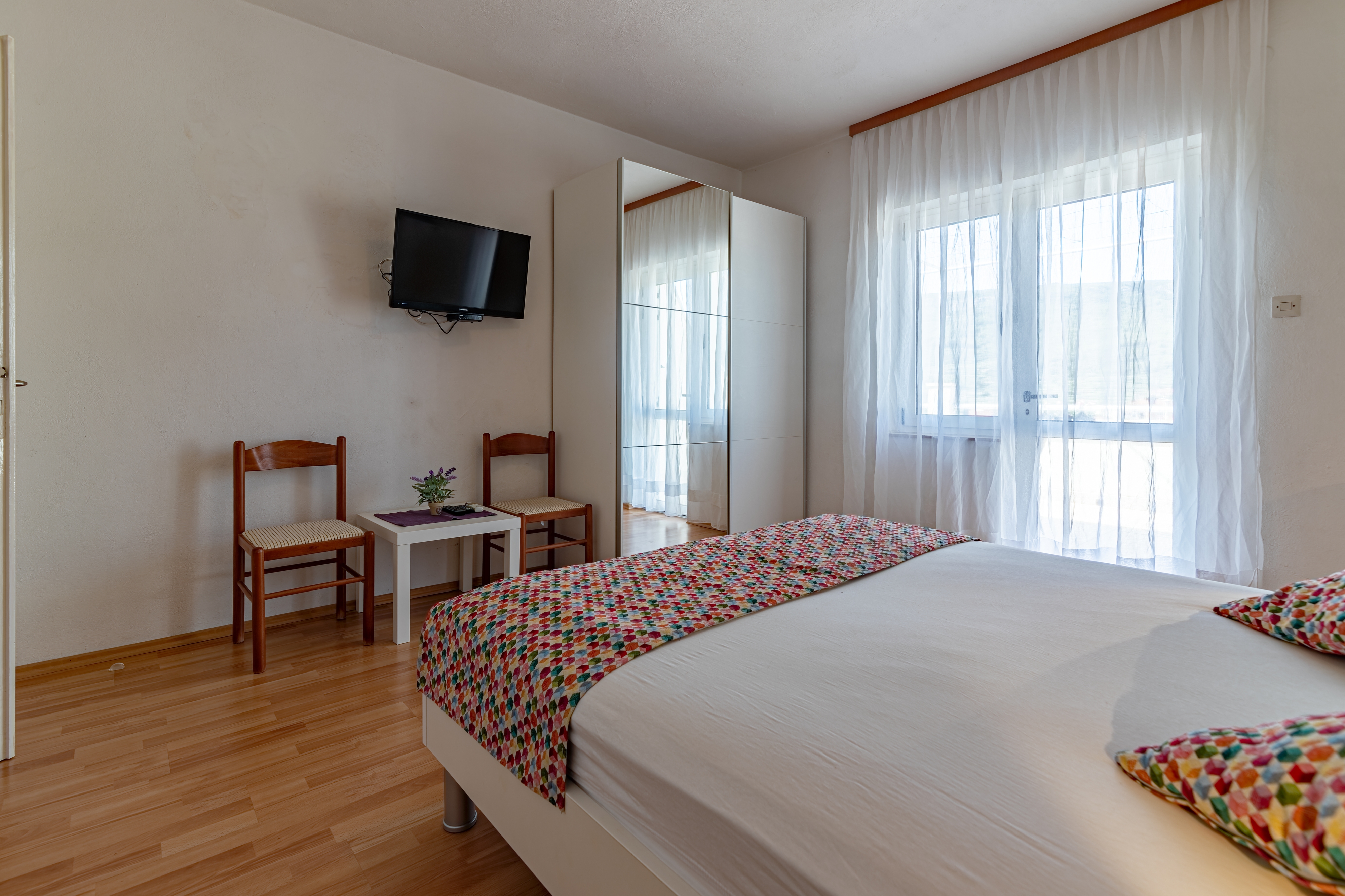 Apartament może przyjąć 4 gości. Łóżka znajdują się w sypialniach, których jest 2, na powierzchni 46m2. Goście mają dostęp do tarasu, by korzystać z ciepłych, letnich wieczorów. Możliwość przygotowywania posiłków poprzez korzystanie ze wspólnego grilla. W kwaterze dozwolony jest pobyt zwierzęcia domowego, za dopłatą. WLICZONE W CENĘ: taksa pobytowa, sprzątanie końcowe, klimatyzacja, parking, internet, łóżeczko dziecięce, żelazko, deska do prasowania, suszarka do włosów. NIEOBOWIĄZKOWE KOSZTY DODATKOWE: pranie bielizny (15,00 € pranie), zwierzęta domowe (15,00 € za nocleg), 2 łóżka dla dzieci (12,00 € osobadzień). Dostępność dodatkowych usług w rezerwowanym terminie oraz ich cenę (jeśli nie jest podana) należy sprawdzić wcześniej. Za dodatowe usługi, które nie zostały uwzględnione w kalkulacji ceny, płaci się bezpośrednio właścicielowi obiektu, pod warunkiem śe gość korzysta z tych usług.