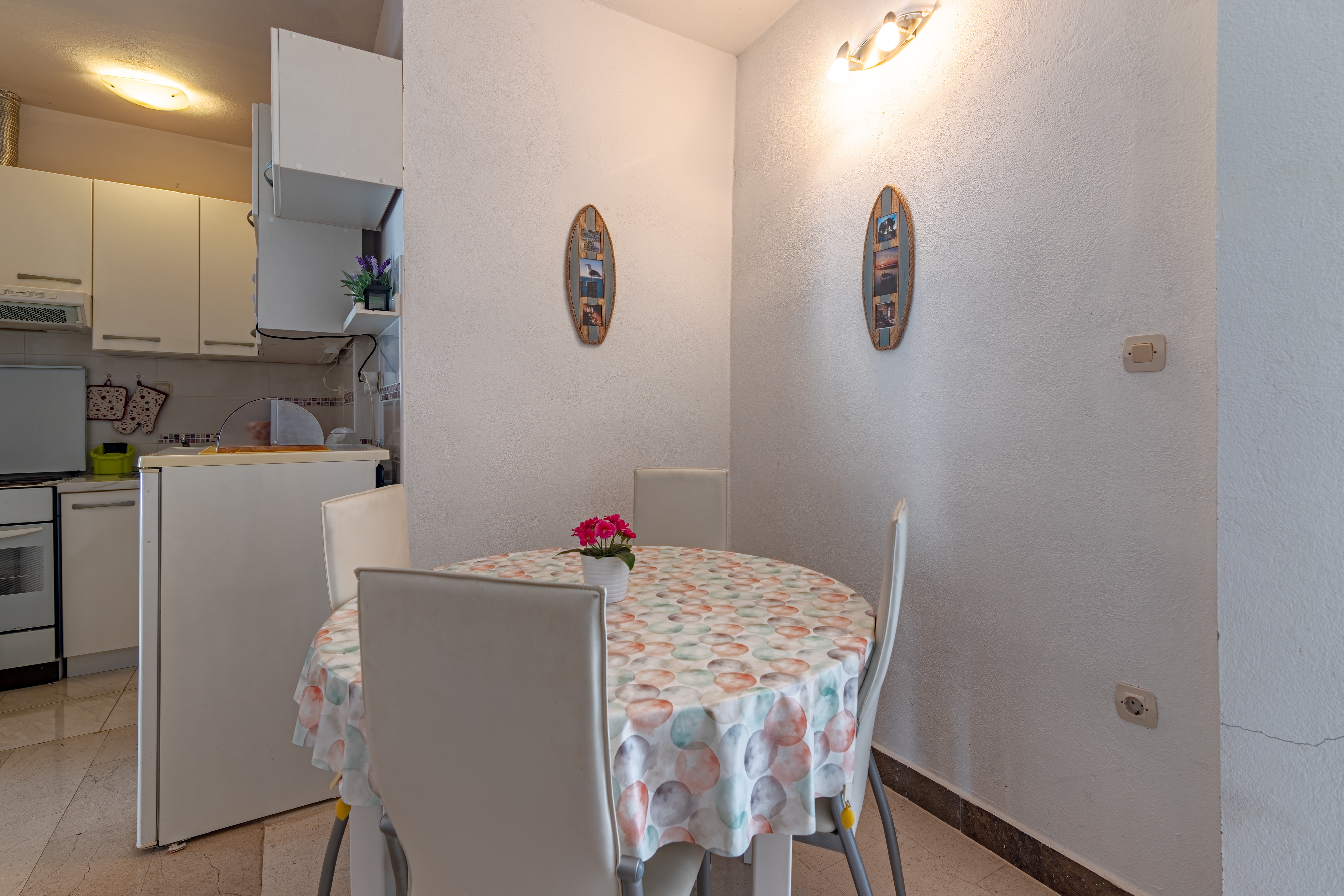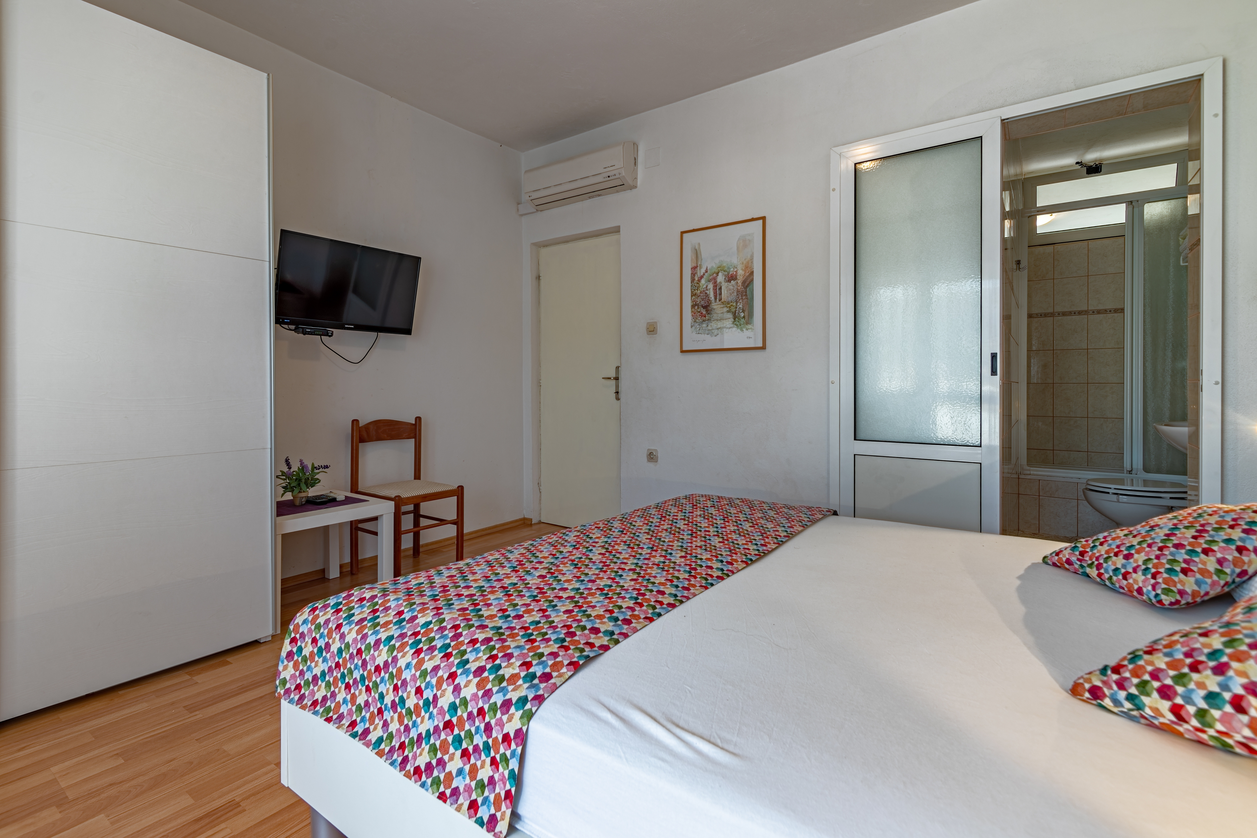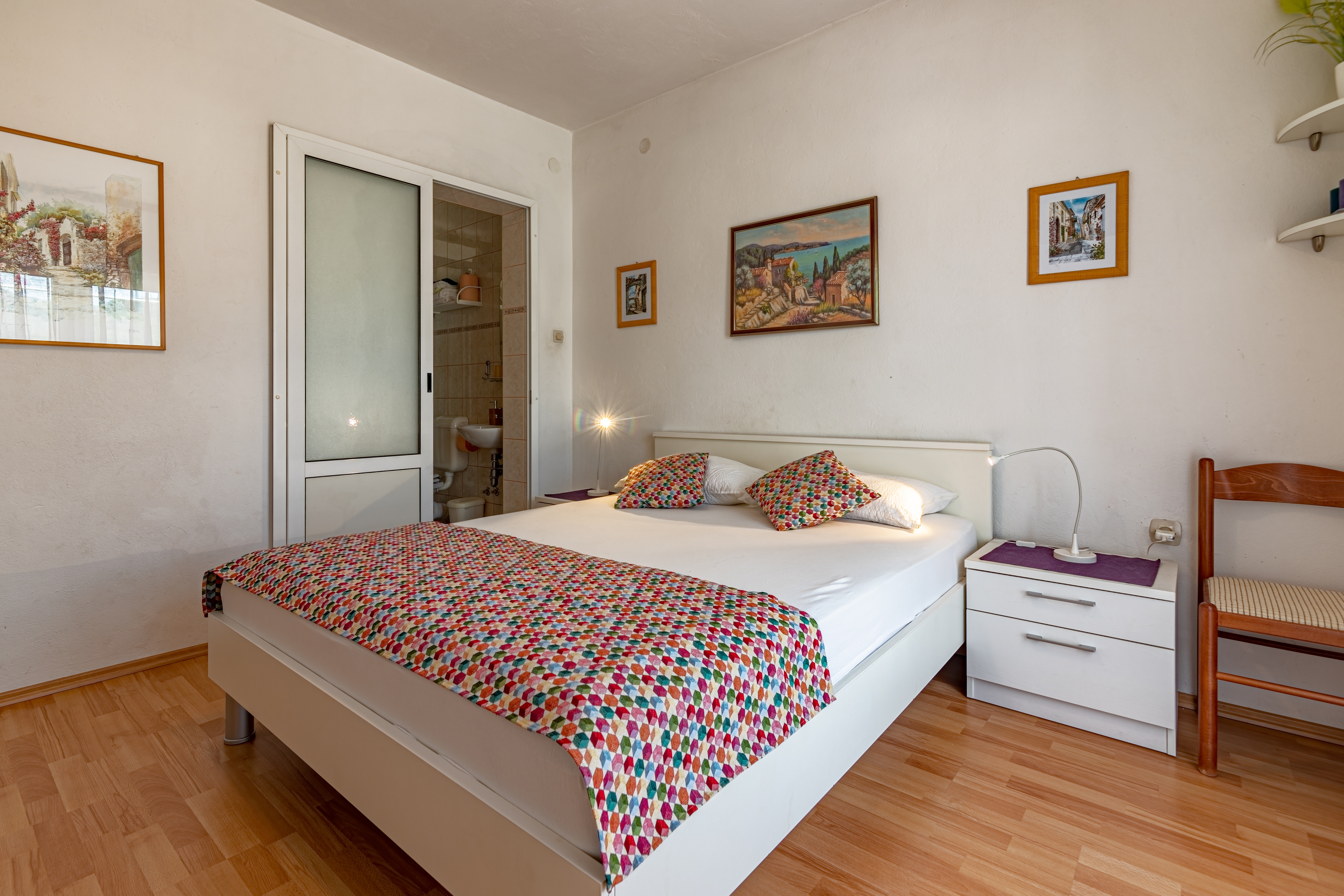 Apartament może przyjąć 4 gości. Łóżka znajdują się w sypialniach, których jest 2, na powierzchni 46m2. Goście mają dostęp do tarasu, by korzystać z ciepłych, letnich wieczorów. Możliwość przygotowywania posiłków poprzez korzystanie ze wspólnego grilla. W kwaterze dozwolony jest pobyt zwierzęcia domowego, za dopłatą. WLICZONE W CENĘ: taksa pobytowa, sprzątanie końcowe, klimatyzacja, parking, internet, łóżeczko dziecięce, żelazko, deska do prasowania, suszarka do włosów. NIEOBOWIĄZKOWE KOSZTY DODATKOWE: pranie bielizny (15,00 € pranie), zwierzęta domowe (15,00 € za nocleg), 2 łóżka dla dzieci (12,00 € osobadzień). Dostępność dodatkowych usług w rezerwowanym terminie oraz ich cenę (jeśli nie jest podana) należy sprawdzić wcześniej. Za dodatowe usługi, które nie zostały uwzględnione w kalkulacji ceny, płaci się bezpośrednio właścicielowi obiektu, pod warunkiem śe gość korzysta z tych usług.