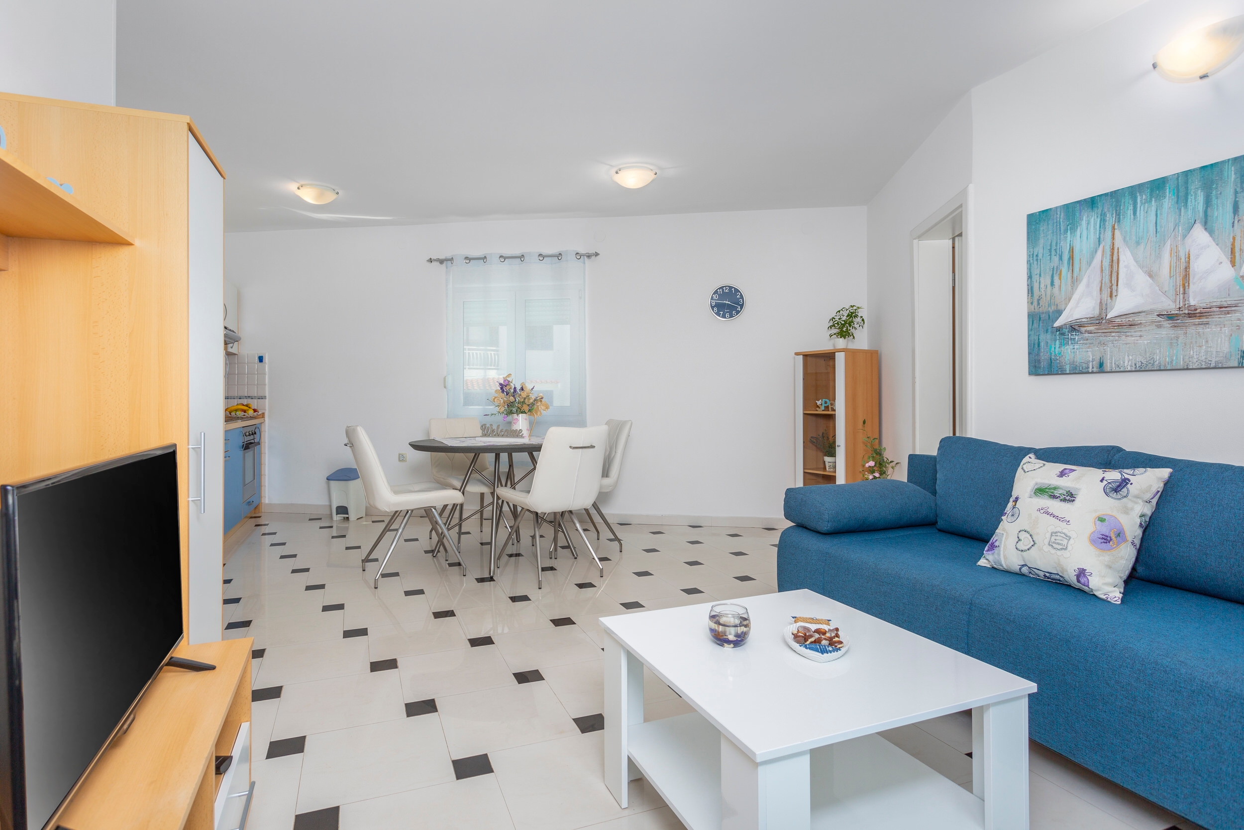 Apartament może przyjąć 4 gości. Łóżka znajdują się w sypialniach, których jest 2, na powierzchni 45m2. Goście mają dostęp do tarasu, by korzystać z ciepłych, letnich wieczorów. Z apartamentu roztacza się widok na morze. Możliwość przygotowywania posiłków poprzez korzystanie ze wspólnego grilla. WLICZONE W CENĘ: taksa pobytowa, sprzątanie końcowe, klimatyzacja, parking, internet, żelazko, deska do prasowania, suszarka do włosów. OBOWIĄZKOWE KOSZTY DODATKOWE: dopłata za krótki termin (procent dopłaty w zalezności od liczby noclegów: 30% - 1, 20% - 2, 10% - 3). Dostępność dodatkowych usług w rezerwowanym terminie oraz ich cenę (jeśli nie jest podana) należy sprawdzić wcześniej. Za dodatowe usługi, które nie zostały uwzględnione w kalkulacji ceny, płaci się bezpośrednio właścicielowi obiektu, pod warunkiem śe gość korzysta z tych usług.