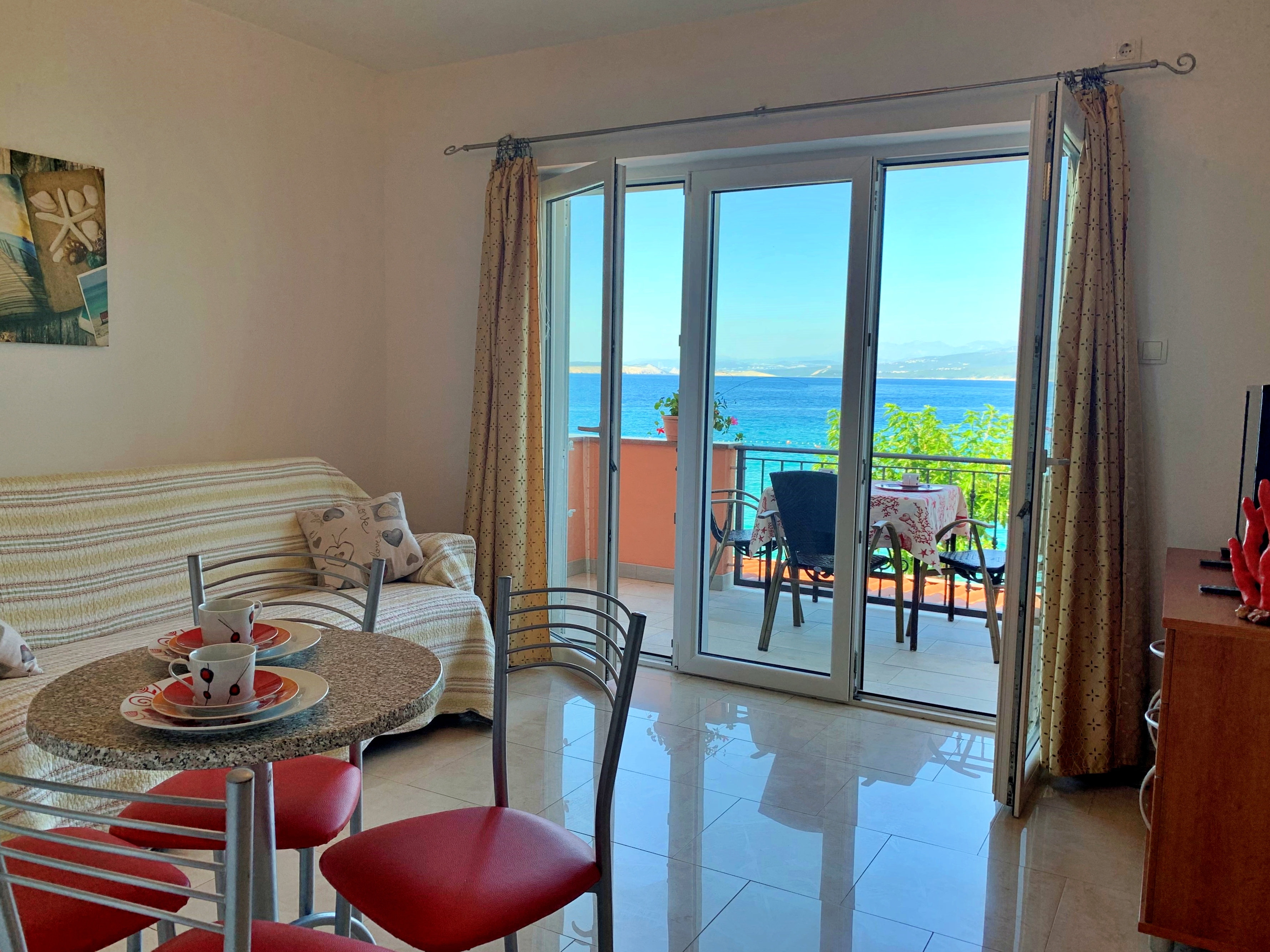 Apartament może przyjąć 3 gości. Łóżka znajdują się w sypialniach, których jest 1, oraz w pokoju dziennym, na powierzchni 32m2. Goście mają dostęp do tarasu, by korzystać z ciepłych, letnich wieczorów. Z apartamentu roztacza się widok na morze. WLICZONE W CENĘ: taksa pobytowa, sprzątanie końcowe, klimatyzacja, parking, internet, suszarka do włosów. Dostępność dodatkowych usług w rezerwowanym terminie oraz ich cenę (jeśli nie jest podana) należy sprawdzić wcześniej. Za dodatowe usługi, które nie zostały uwzględnione w kalkulacji ceny, płaci się bezpośrednio właścicielowi obiektu, pod warunkiem śe gość korzysta z tych usług.