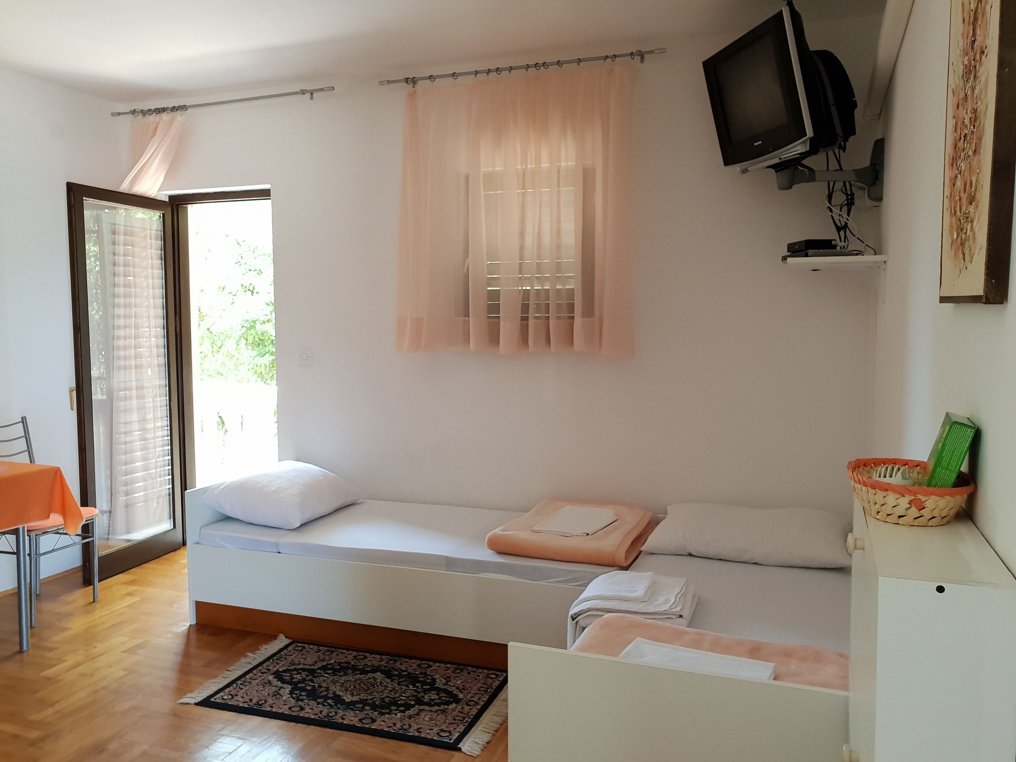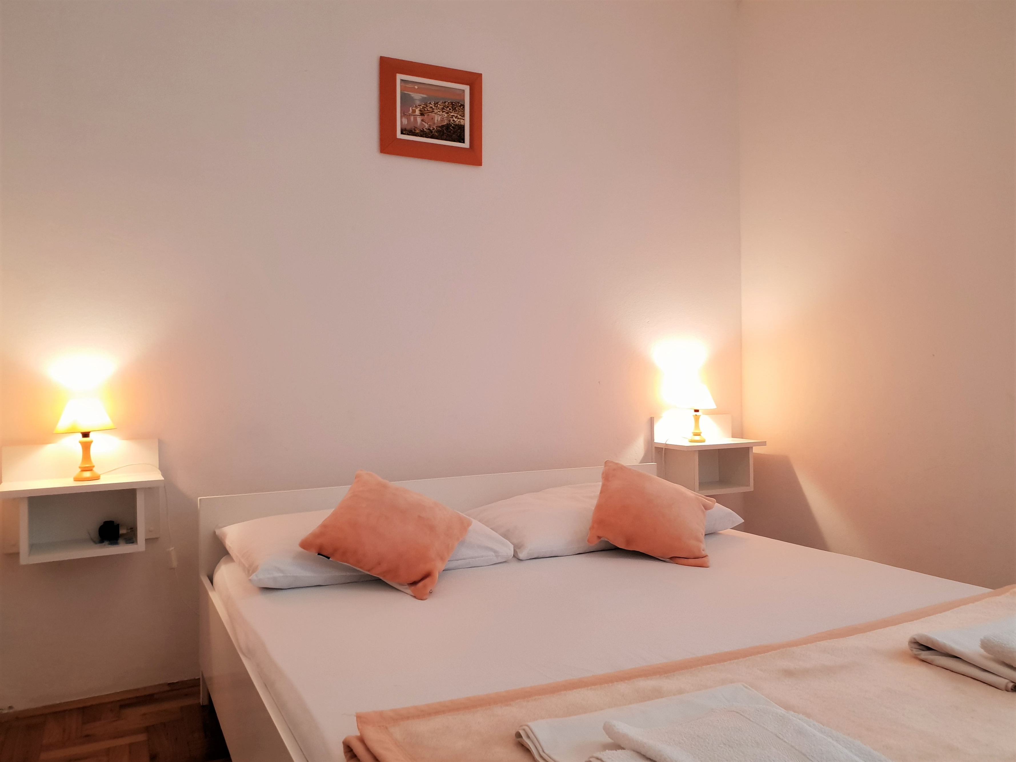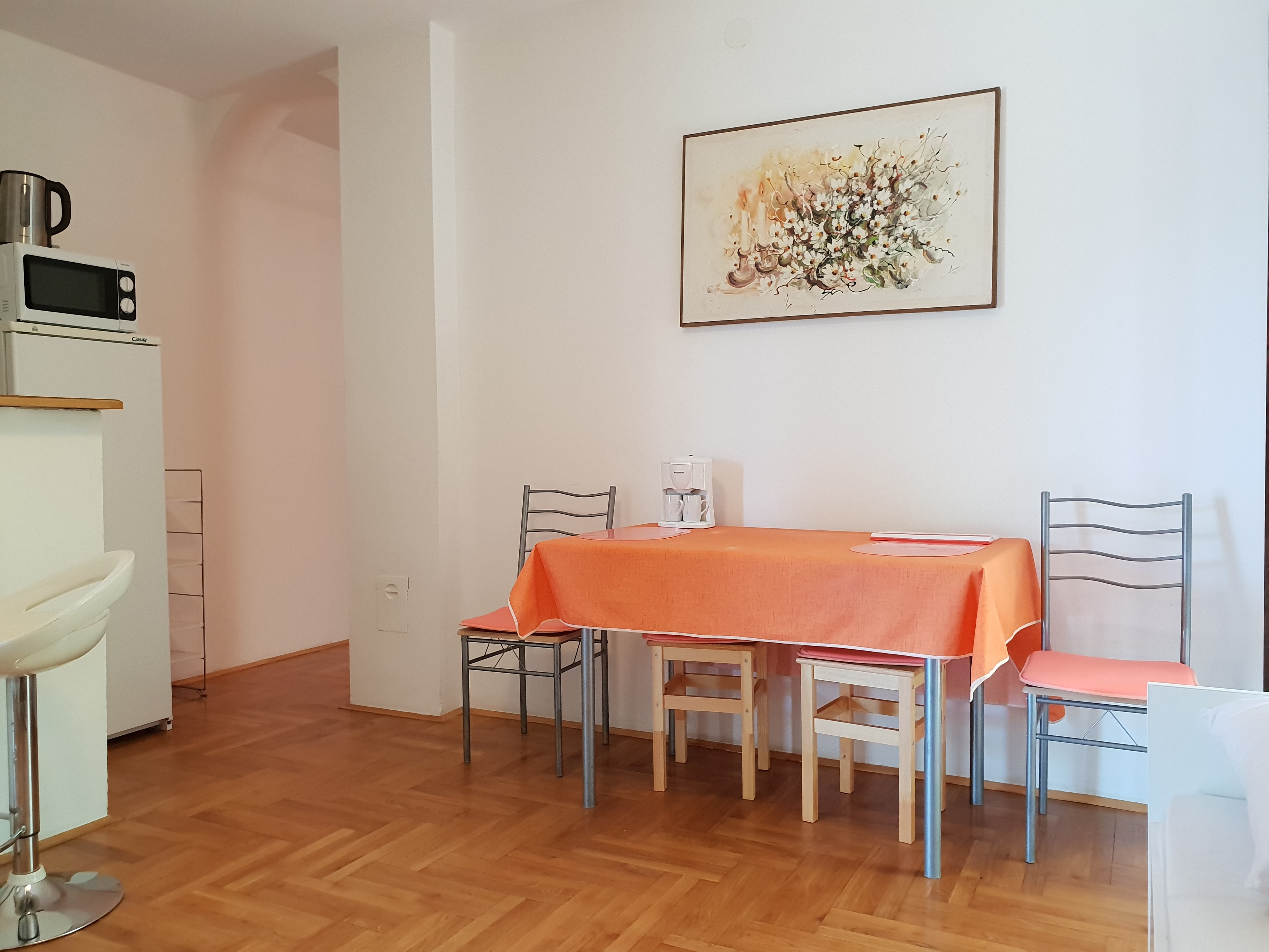 Apartament może przyjąć 4 gości. Łóżka znajdują się w sypialniach, których jest 1, oraz w pokoju dziennym, na powierzchni 38m2. Goście mają dostęp do balkonu, by korzystać z ciepłych, letnich wieczorów. Możliwość przygotowywania posiłków poprzez korzystanie ze wspólnego grilla. W kwaterze dozwolony jest pobyt zwierzęcia domowego, za dopłatą. Rezerwowana kwatera ma taras wspólny z inną kwaterą. WLICZONE W CENĘ: taksa pobytowa, sprzątanie końcowe, klimatyzacja, parking, internet, suszarka do włosów. NIEOBOWIĄZKOWE KOSZTY DODATKOWE: zwierzęta domowe (10,00 € za nocleg). Dostępność dodatkowych usług w rezerwowanym terminie oraz ich cenę (jeśli nie jest podana) należy sprawdzić wcześniej. Za dodatowe usługi, które nie zostały uwzględnione w kalkulacji ceny, płaci się bezpośrednio właścicielowi obiektu, pod warunkiem śe gość korzysta z tych usług.