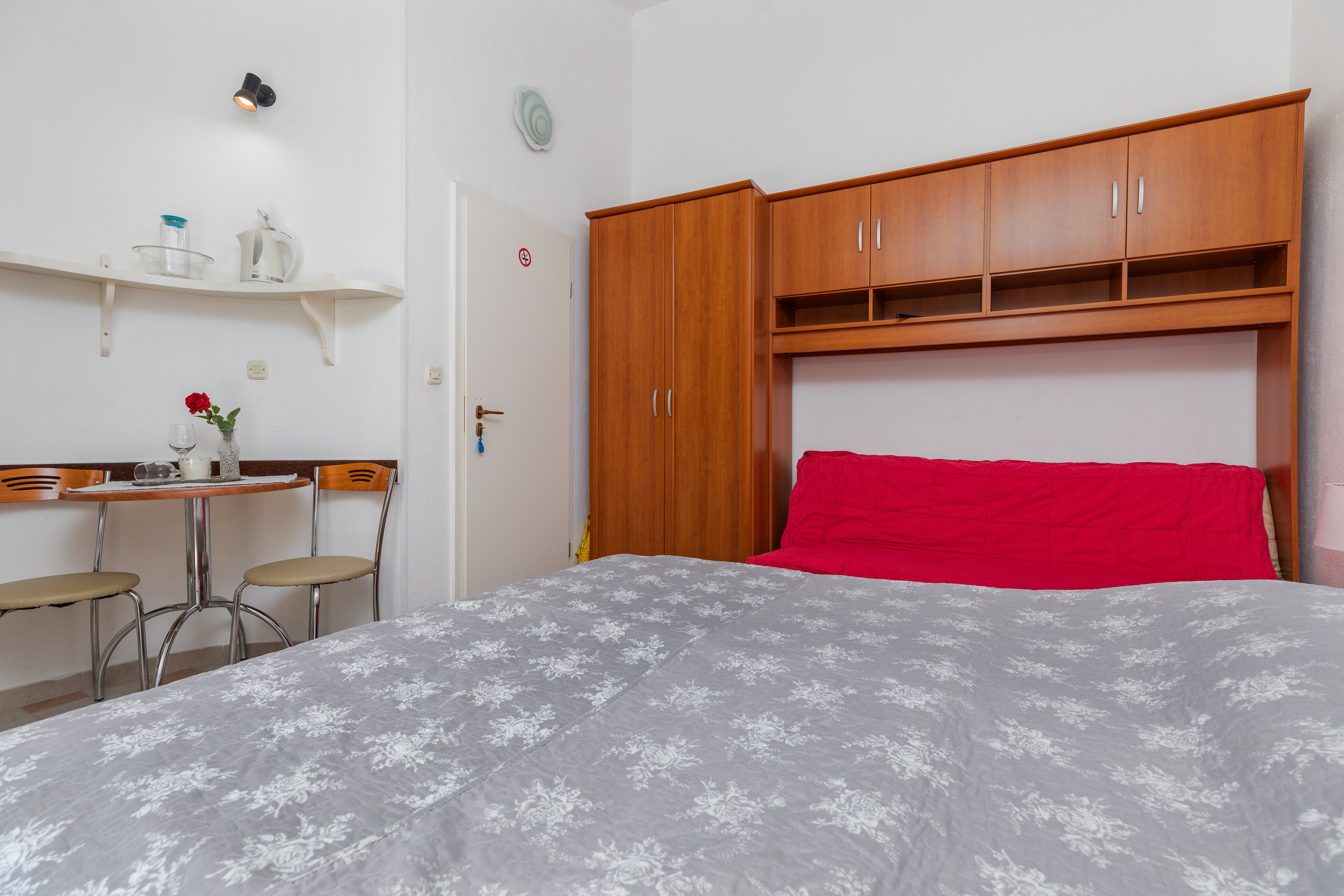 Studio może przyjąć 2 gości. Łóżka znajdują się w sypialniach, których jest 1, na powierzchni 19m2. Goście mają dostęp do balkonu, by korzystać z ciepłych, letnich wieczorów. Z apartamentu typu studio roztacza się widok na morze. Możliwość przygotowywania posiłków poprzez korzystanie ze wspólnego grilla. WLICZONE W CENĘ: taksa pobytowa, sprzątanie końcowe, klimatyzacja, parking, internet, łóżeczko dziecięce, żelazko, deska do prasowania, suszarka do włosów. OBOWIĄZKOWE KOSZTY DODATKOWE: dopłata za krótki termin (procent dopłaty w zalezności od liczby noclegów: 30% - 1, 20% - 2, 10% - 3). Dostępność dodatkowych usług w rezerwowanym terminie oraz ich cenę (jeśli nie jest podana) należy sprawdzić wcześniej. Za dodatowe usługi, które nie zostały uwzględnione w kalkulacji ceny, płaci się bezpośrednio właścicielowi obiektu, pod warunkiem śe gość korzysta z tych usług. Zniżki od ceny podstawowej: bezpłatny dzień 14=13 (przy pobycie, trwającym co najmniej 14 dni, otrzymujecie jeden bezpłatny dzień na pobyt do 31.12.2026).
