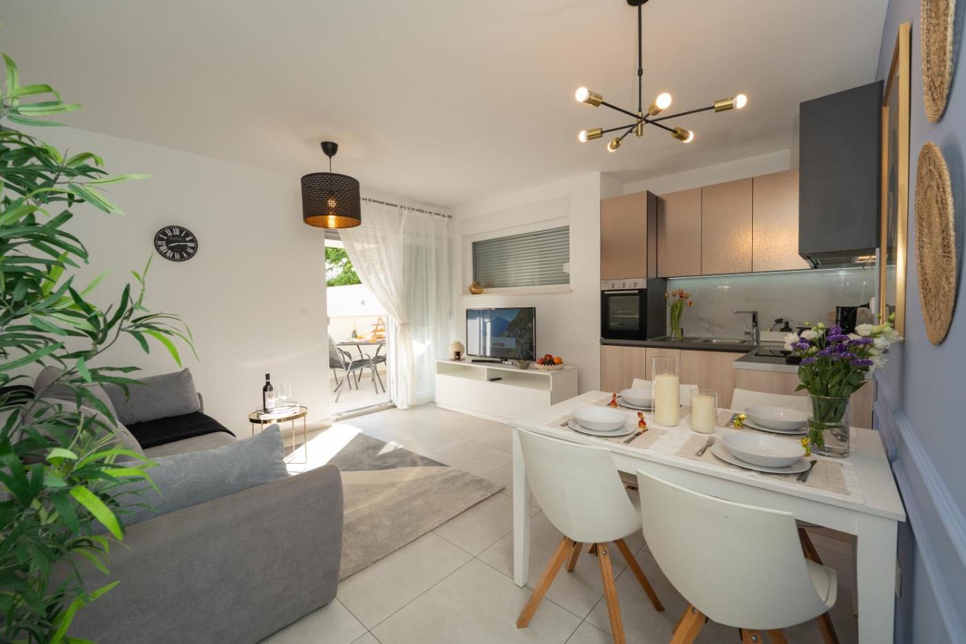 Apartament typu Deluxe z 1 sypialnią. This apartment features a private pool. Boasting a private entrance, this air-conditioned apartment features 1 living room, 1 separate bedroom and 1 bathroom with a shower and a hairdryer. The fully equipped kitchen features a stovetop, a refrigerator, a dishwasher and kitchenware. This apartment has a tea and coffee maker, a seating area, flat-screen TV with cable channels, as well as winechampagne for guests. The unit has 2 beds. Apartament - 4 osobowy. Powierzchnia pokoju ok.: 44 mkw.