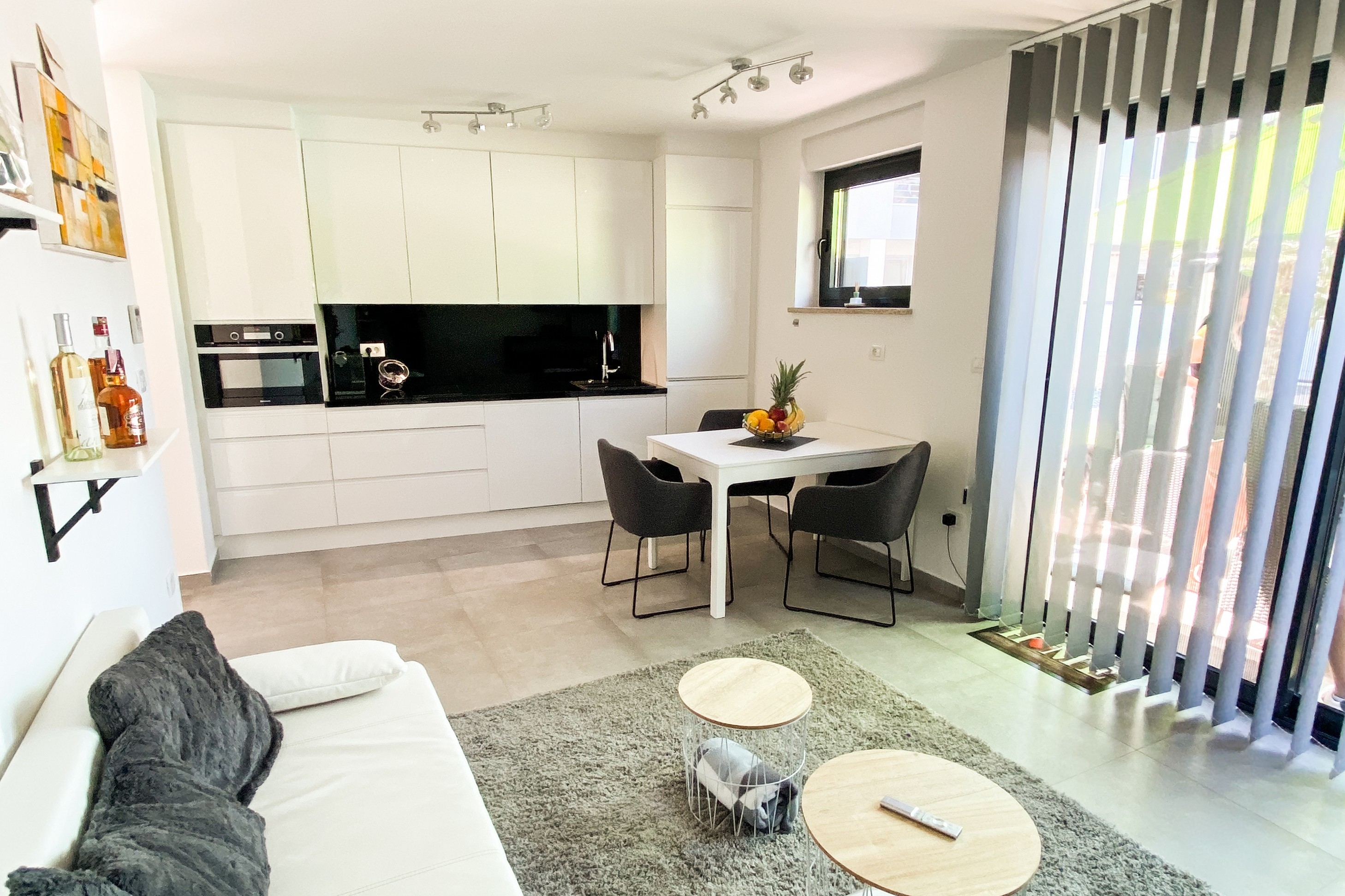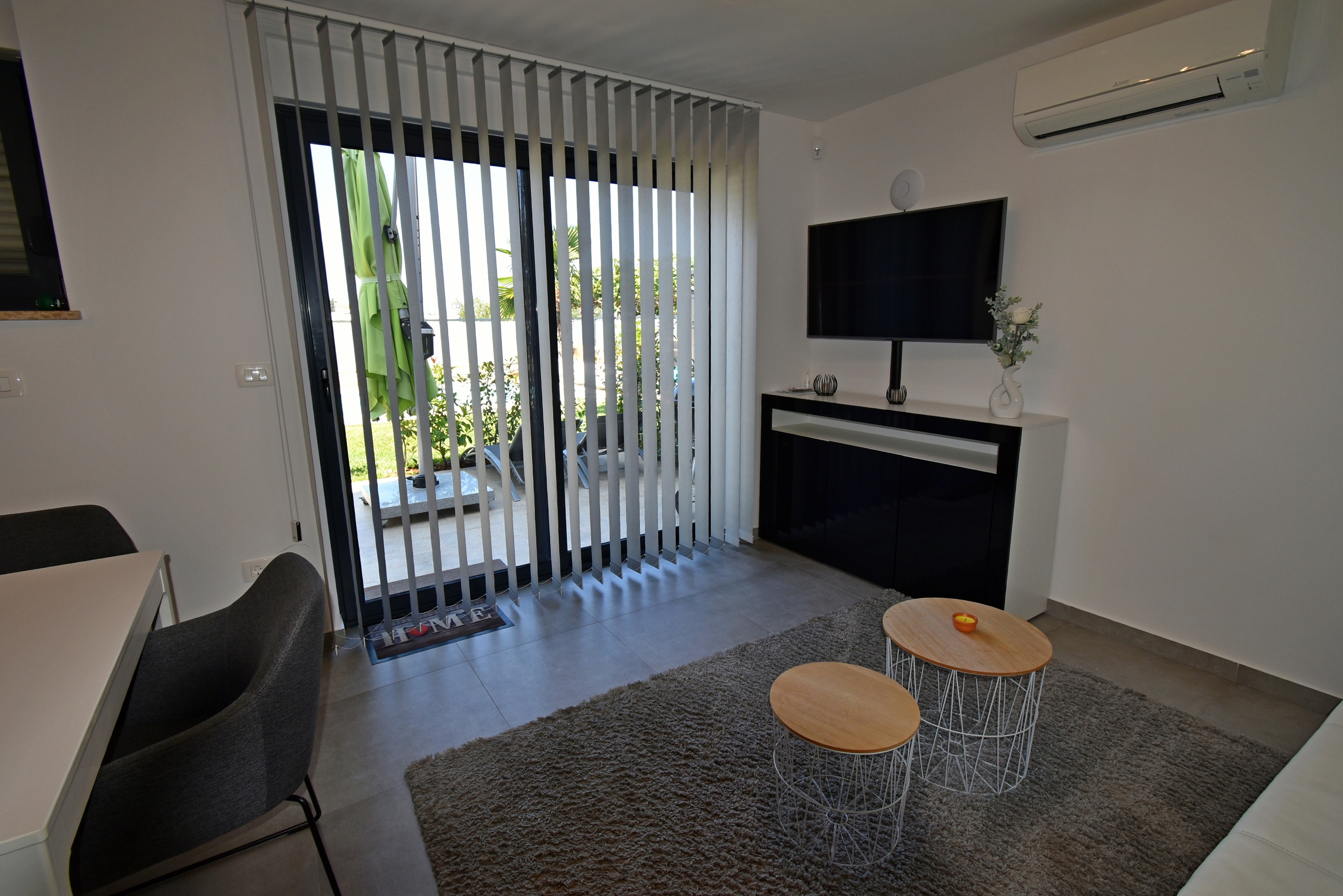 Apartament może przyjąć 4 gości. Łóżka znajdują się w sypialniach, których jest 1, oraz w pokoju dziennym, na powierzchni 41m2. Goście mają dostęp do tarasu, by korzystać z ciepłych, letnich wieczorów. Z apartamentu roztacza się widok na morze. Możliwość przygotowywania posiłków poprzez korzystanie ze wspólnego grilla. W trakcie swojego pobytu goście mogą korzystać ze wspólnego basenu. Do kwatery można przyjechać ze zwierzęciem domowym, a usługa jest wliczona w cenę wynajęcia kwatery. WLICZONE W CENĘ: taksa pobytowa, sprzątanie końcowe, klimatyzacja, basen, parking, internet, zwierzęta domowe, rower, łóżeczko dziecięce, żelazko, deska do prasowania, suszarka do włosów, przenośny grill, parasol, leżaki. Dostępność dodatkowych usług w rezerwowanym terminie oraz ich cenę (jeśli nie jest podana) należy sprawdzić wcześniej. Za dodatowe usługi, które nie zostały uwzględnione w kalkulacji ceny, płaci się bezpośrednio właścicielowi obiektu, pod warunkiem śe gość korzysta z tych usług.