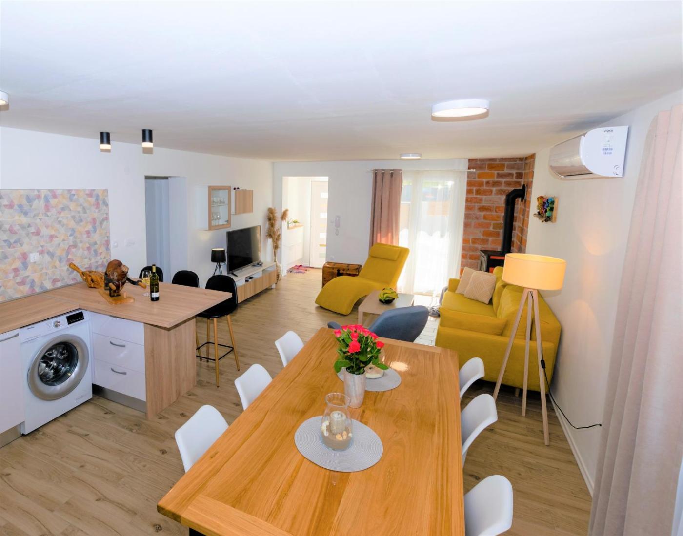 Dom wakacyjny. Boasting a private entrance, this air-conditioned holiday home comes with 1 living room, 2 separate bedrooms and 1 bathroom with a walk-in shower and a hairdryer. Guests can make meals in the kitchen that features a stovetop, a refrigerator, a dishwasher and kitchenware. Featuring a terrace with river views, this holiday home also features a washing machine and a flat-screen TV with satellite channels. The unit has 3 beds. Dom wakacyjny - 6 osobowy. Powierzchnia pokoju ok.: 65 mkw.