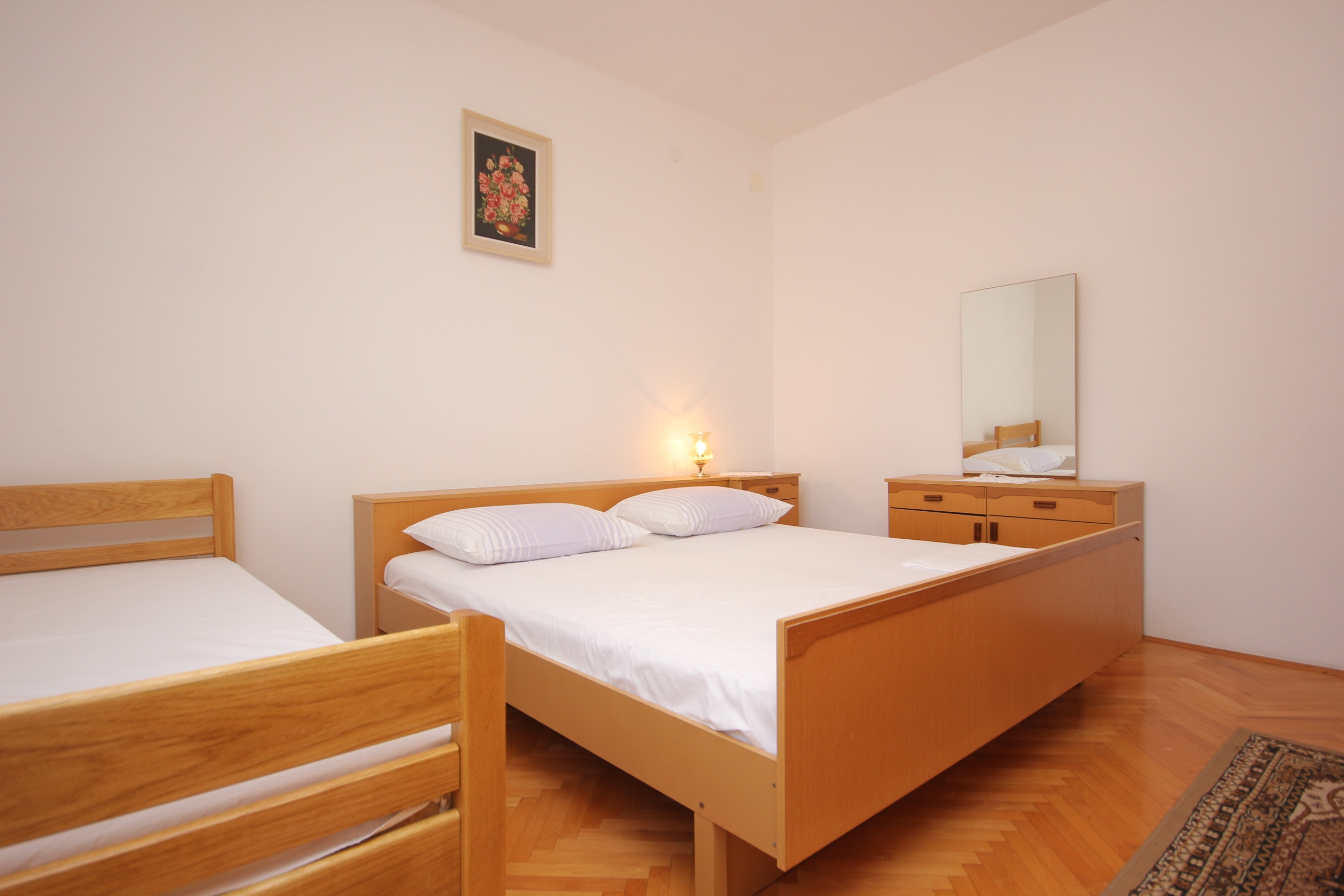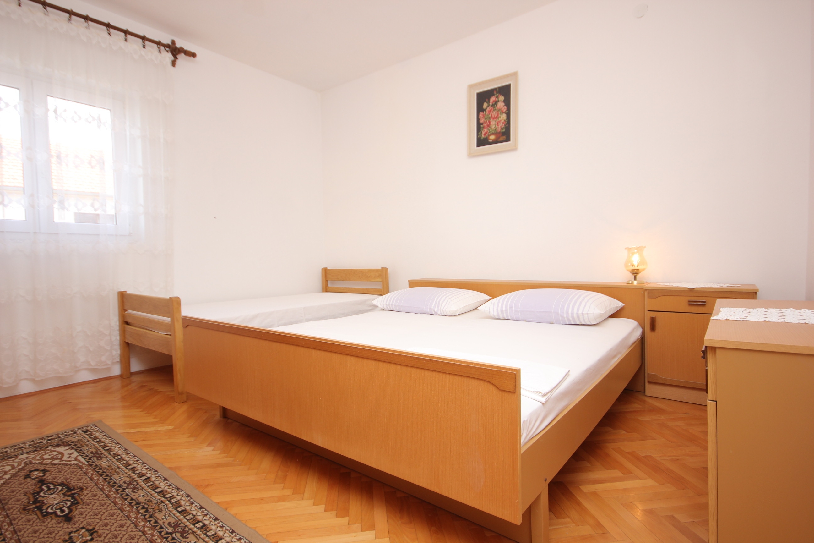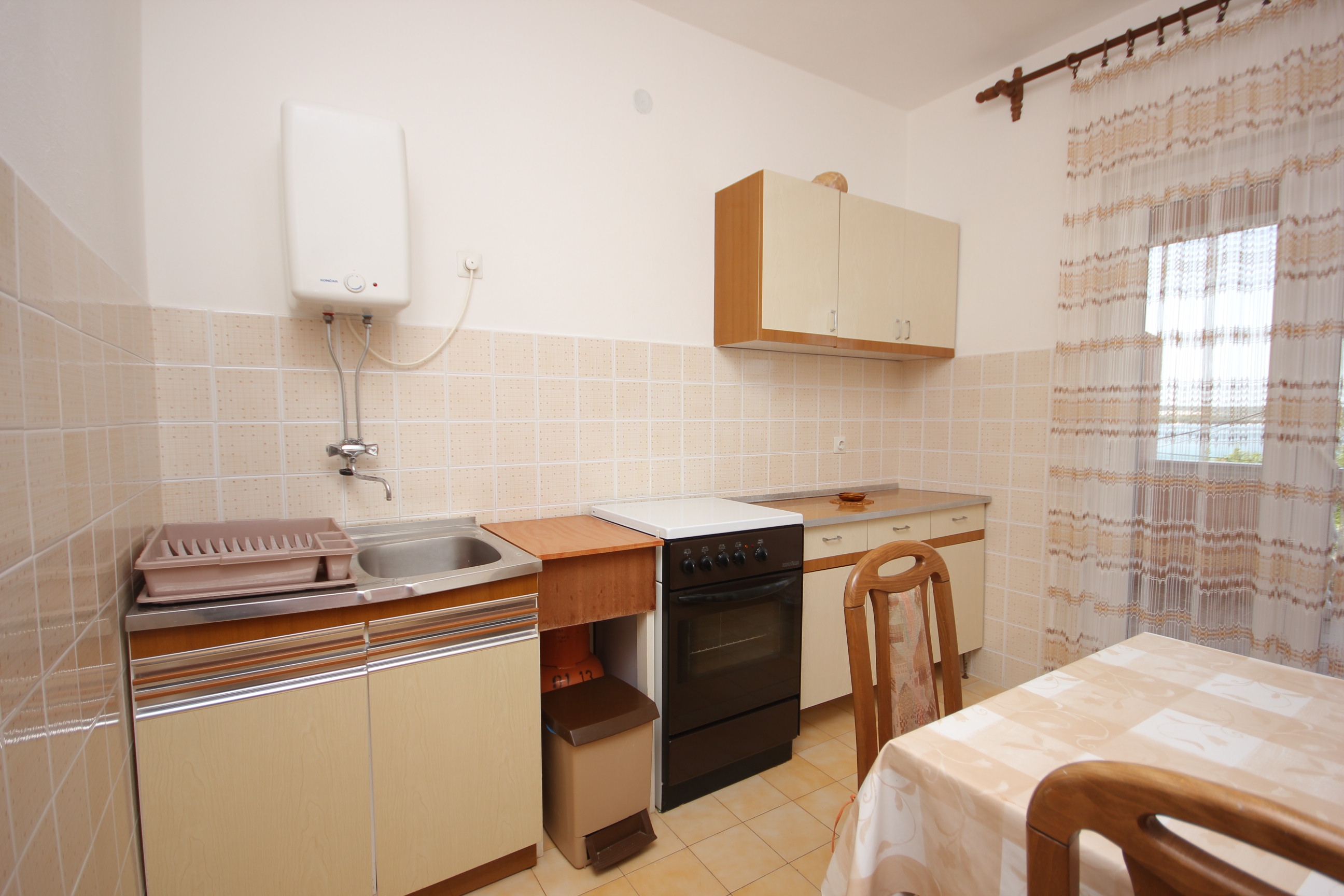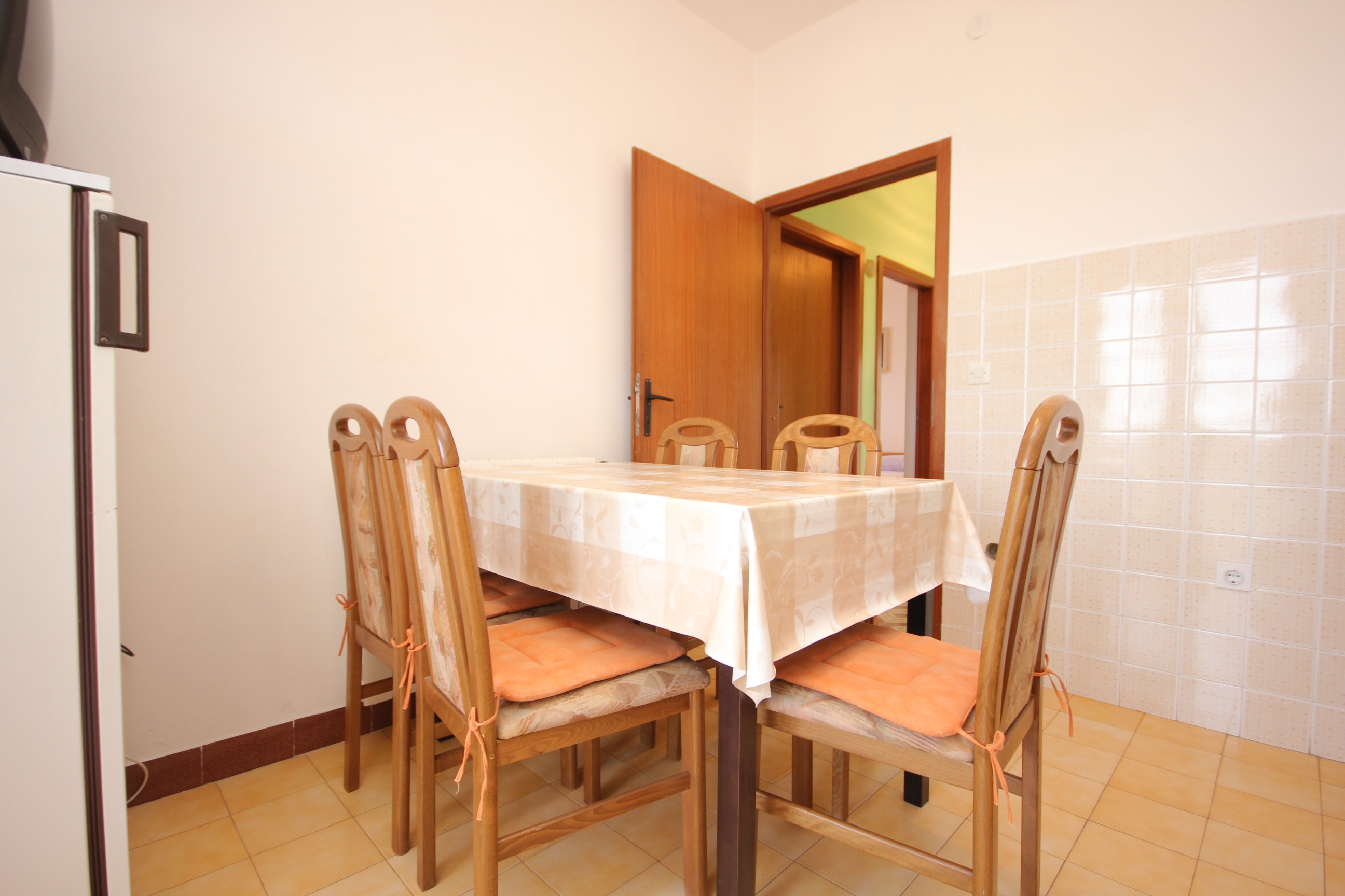 Apartament może przyjąć 5 gości. Łóżka znajdują się w sypialniach, których jest 2, na powierzchni 56m2. Goście mają dostęp do tarasu, by korzystać z ciepłych, letnich wieczorów. Z apartamentu roztacza się widok na morze. Możliwość przygotowywania posiłków poprzez korzystanie ze wspólnego grilla. WLICZONE W CENĘ: taksa pobytowa, sprzątanie końcowe, klimatyzacja, centralne ogrzewanie, parking, internet, pranie bielizny, miejsce do cumowania łodzi. OBOWIĄZKOWE KOSZTY DODATKOWE: dopłata za krótki termin (procent dopłaty w zalezności od liczby noclegów: 30% - 1, 20% - 2, 10% - 3). NIEOBOWIĄZKOWE KOSZTY DODATKOWE: łódź (50,00 € za nocleg). Dostępność dodatkowych usług w rezerwowanym terminie oraz ich cenę (jeśli nie jest podana) należy sprawdzić wcześniej. Za dodatowe usługi, które nie zostały uwzględnione w kalkulacji ceny, płaci się bezpośrednio właścicielowi obiektu, pod warunkiem śe gość korzysta z tych usług.