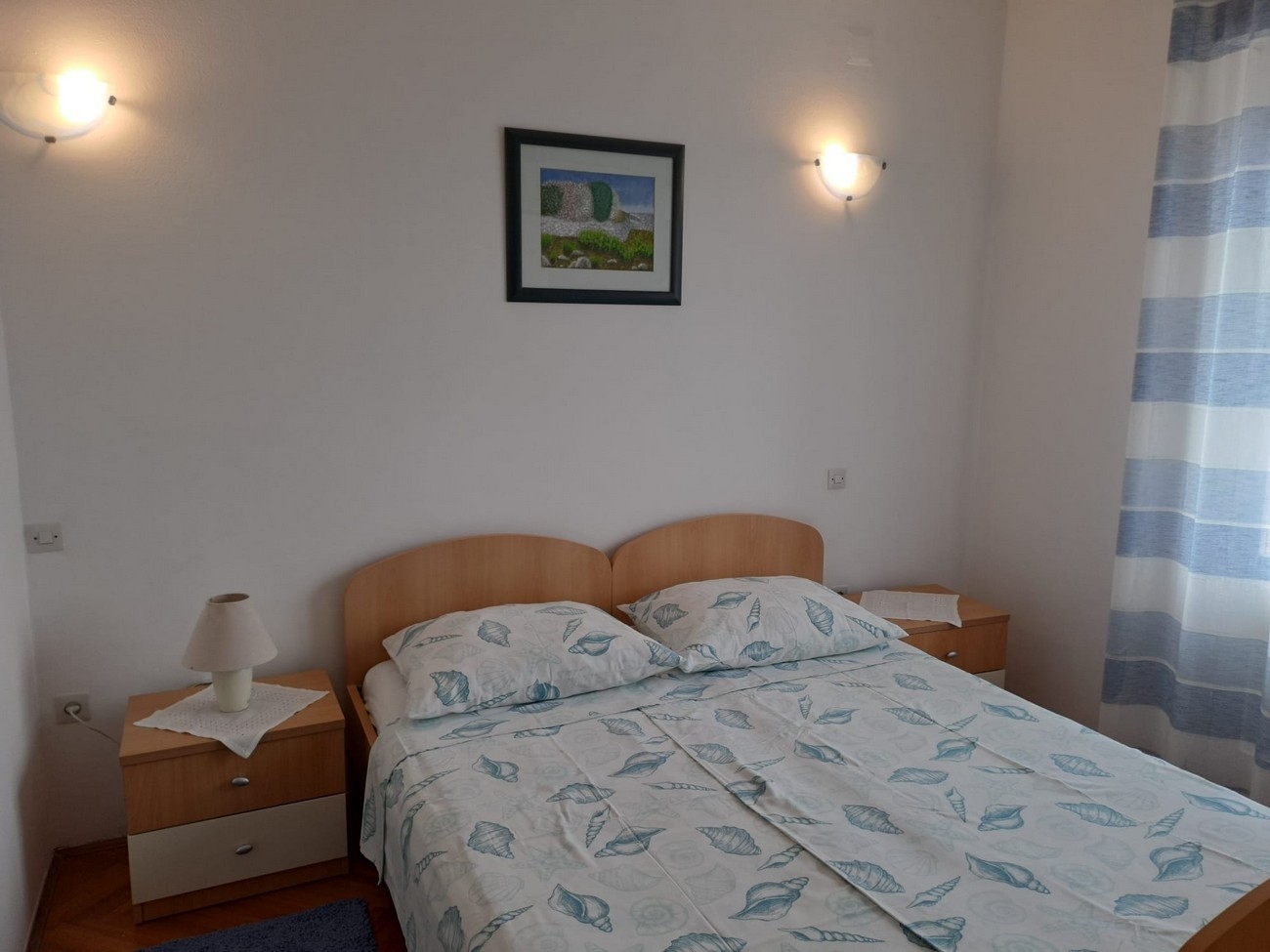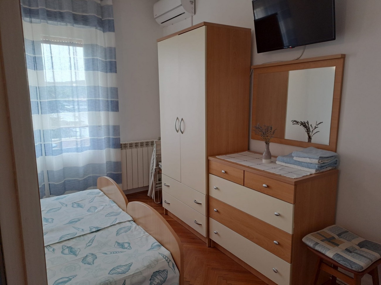 Pokój może przyjąć 2 gości. Łóżka znajdują się w sypialniach, których jest 1, na powierzchni 17m2. Goście mają dostęp do balkonu, by korzystać z ciepłych, letnich wieczorów. Z pokoju roztacza się widok na morze. Możliwość przygotowywania posiłków poprzez korzystanie ze wspólnego grilla. W kwaterze dozwolony jest pobyt zwierzęcia domowego, za dopłatą. Rezerwowana kwatera to pokój z własną łazienką, bez możliwości korzystania z kuchni. WLICZONE W CENĘ: taksa pobytowa, sprzątanie końcowe, klimatyzacja, centralne ogrzewanie, parking, internet. OBOWIĄZKOWE KOSZTY DODATKOWE: dopłata za krótki termin (procent dopłaty w zalezności od liczby noclegów: 30% - 1, 20% - 2, 10% - 3). NIEOBOWIĄZKOWE KOSZTY DODATKOWE: śniadanie (10,00 €, 50% zniżki dla dzieci od 4 do 12 lat, Bezpłatne dla dzieci do 4 lat), pranie bielizny (5,00 € pranie), miejsce do cumowania łodzi (5,00 € za nocleg), zwierzęta domowe (10,00 € za nocleg). Dostępność dodatkowych usług w rezerwowanym terminie oraz ich cenę (jeśli nie jest podana) należy sprawdzić wcześniej. Za dodatowe usługi, które nie zostały uwzględnione w kalkulacji ceny, płaci się bezpośrednio właścicielowi obiektu, pod warunkiem śe gość korzysta z tych usług.