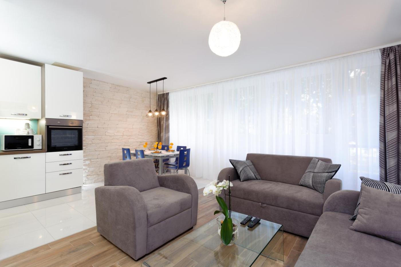 Apartment. Featuring free Wi-Fi, the air-conditioned apartment includes a seating area with sofas and a TV. The kitchen is equipped with a stove and oven. The bathroom comes with a bath or shower.