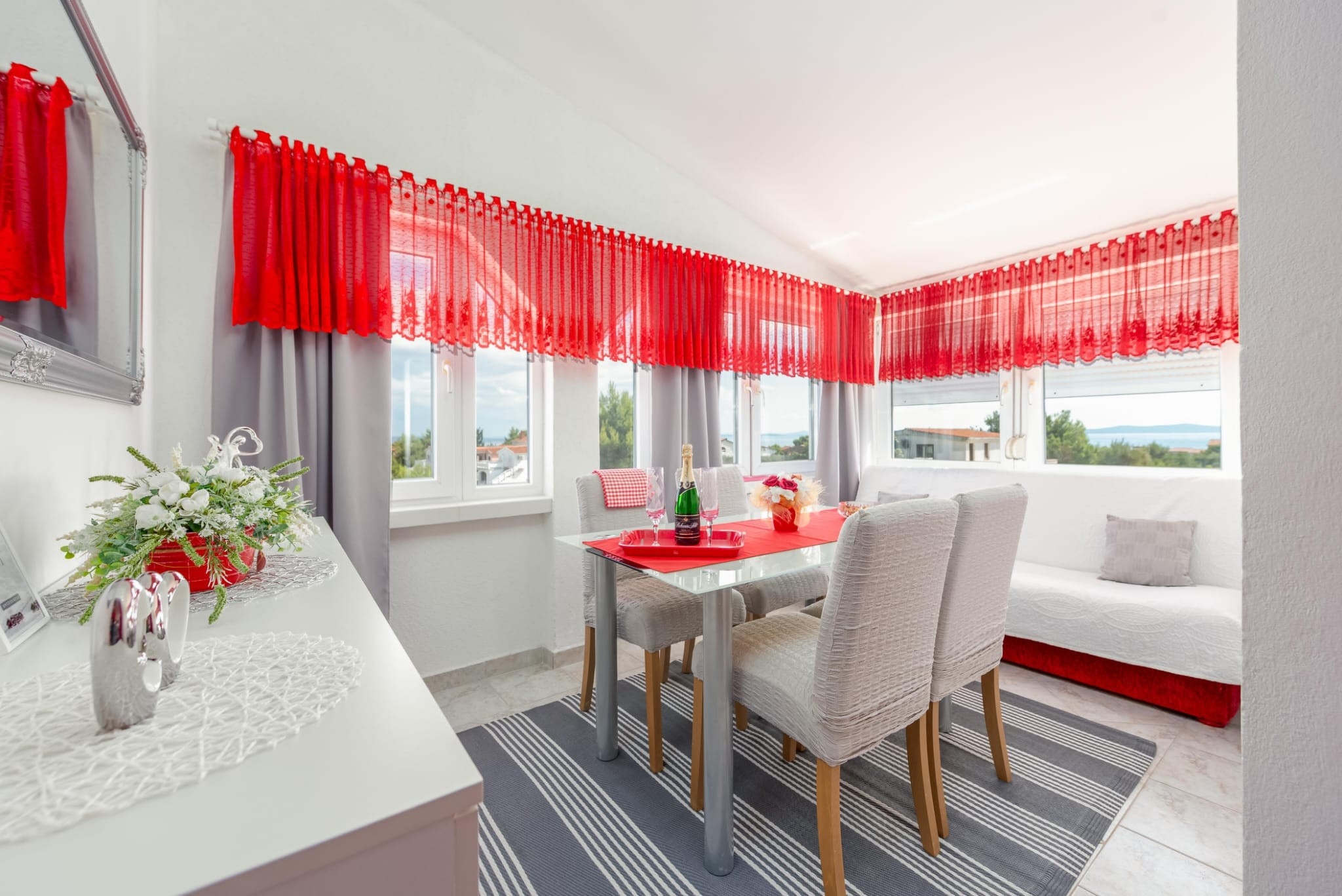 Apartament może przyjąć 4 gości. Łóżka znajdują się w sypialniach, których jest 1, oraz w pokoju dziennym, na powierzchni 51m2. Goście mają dostęp do tarasu, by korzystać z ciepłych, letnich wieczorów. Z apartamentu roztacza się widok na morze. Możliwość przygotowywania posiłków poprzez korzystanie ze wspólnego grilla. WLICZONE W CENĘ: taksa pobytowa, sprzątanie końcowe, klimatyzacja, parking, internet, łóżeczko dziecięce, suszarka do włosów. OBOWIĄZKOWE KOSZTY DODATKOWE: dopłata za krótki termin (procent dopłaty w zalezności od liczby noclegów: 30% - 1, 20% - 2, 10% - 3). Dostępność dodatkowych usług w rezerwowanym terminie oraz ich cenę (jeśli nie jest podana) należy sprawdzić wcześniej. Za dodatowe usługi, które nie zostały uwzględnione w kalkulacji ceny, płaci się bezpośrednio właścicielowi obiektu, pod warunkiem śe gość korzysta z tych usług.