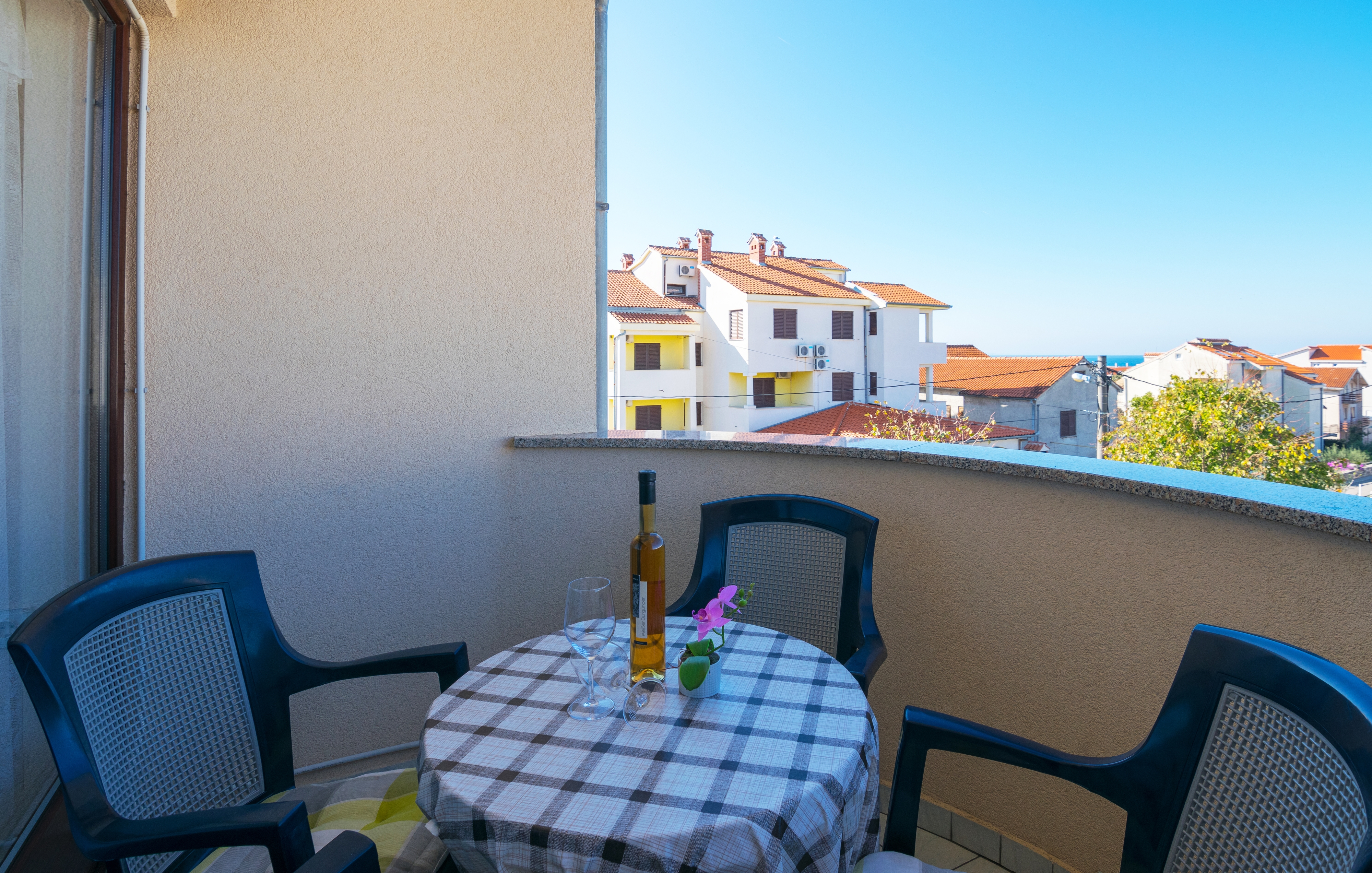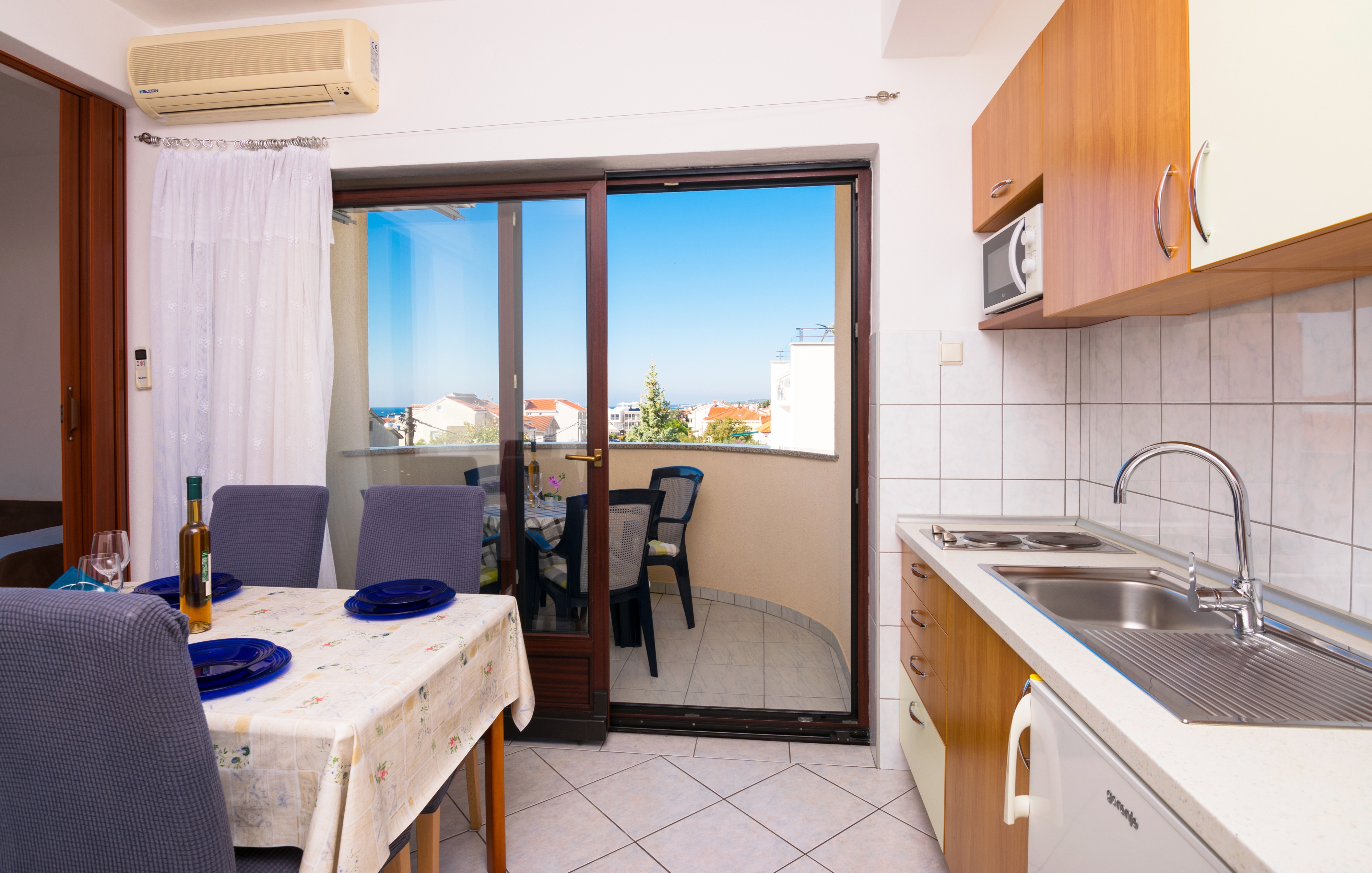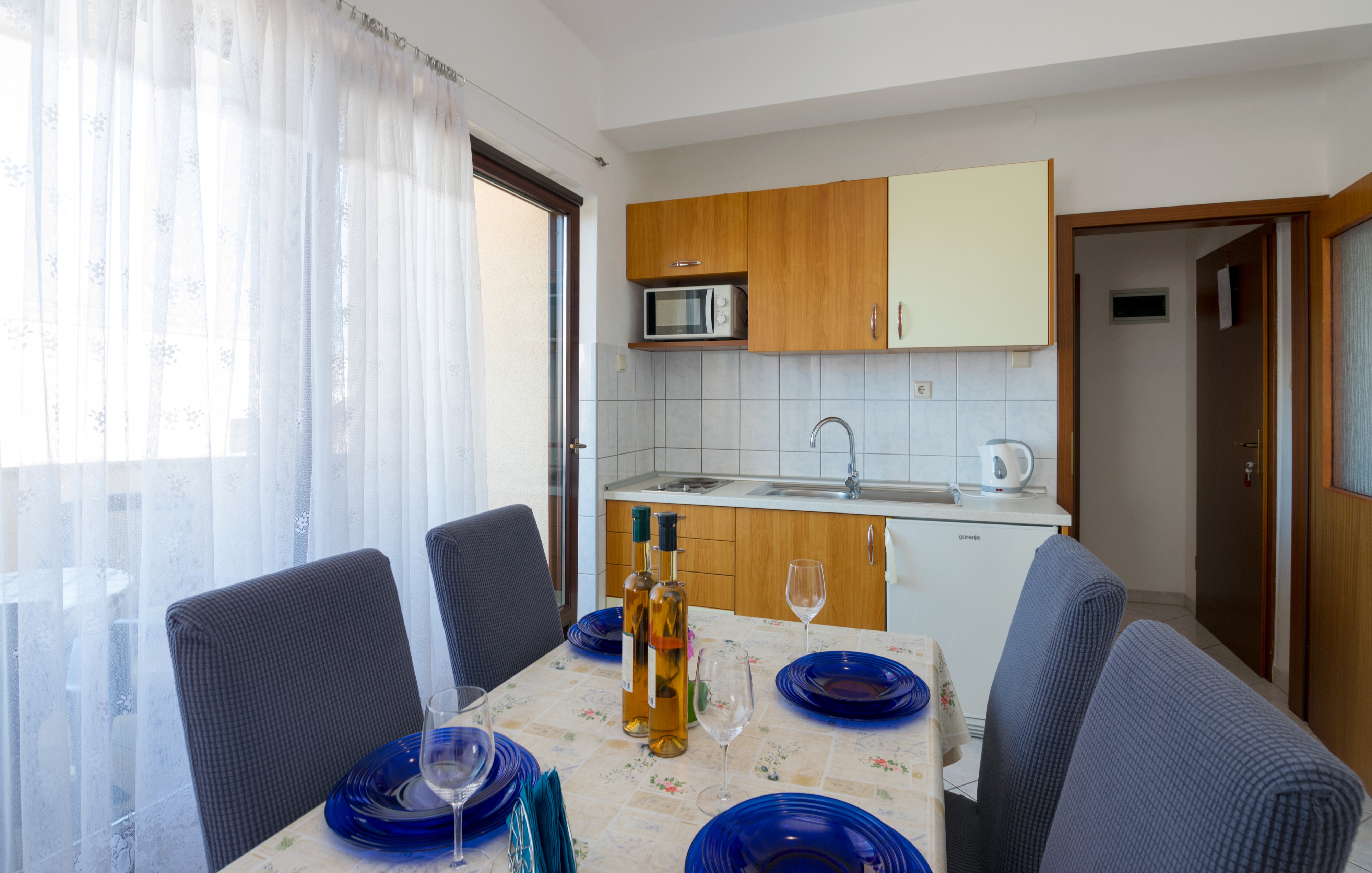 Apartament może przyjąć 4 gości. Łóżka znajdują się w sypialniach, których jest 1, oraz w pokoju dziennym, na powierzchni 40m2. Goście mają dostęp do tarasu, by korzystać z ciepłych, letnich wieczorów. Z apartamentu roztacza się widok na morze. Możliwość przygotowywania posiłków poprzez korzystanie ze wspólnego grilla. WLICZONE W CENĘ: taksa pobytowa, sprzątanie końcowe, klimatyzacja, parking, internet, dostawka, żelazko, deska do prasowania, suszarka do włosów. OBOWIĄZKOWE KOSZTY DODATKOWE: dopłata za krótki termin (procent dopłaty w zalezności od liczby noclegów: 30% - 1, 20% - 2, 10% - 3). NIEOBOWIĄZKOWE KOSZTY DODATKOWE: pranie bielizny (5,00 € pranie). Dostępność dodatkowych usług w rezerwowanym terminie oraz ich cenę (jeśli nie jest podana) należy sprawdzić wcześniej. Za dodatowe usługi, które nie zostały uwzględnione w kalkulacji ceny, płaci się bezpośrednio właścicielowi obiektu, pod warunkiem śe gość korzysta z tych usług.