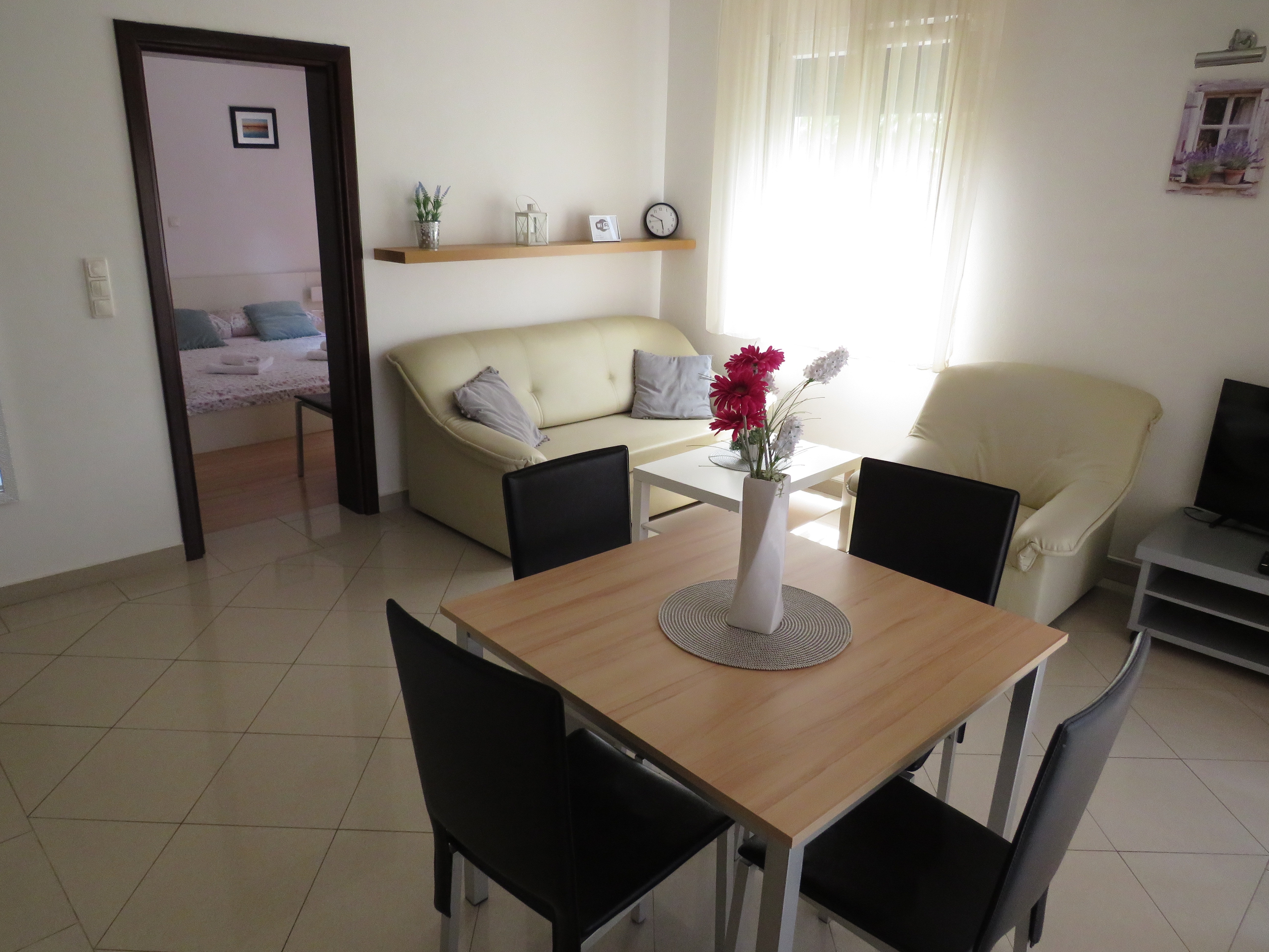 Apartament może przyjąć 4 gości. Łóżka znajdują się w sypialniach, których jest 2, na powierzchni 49m2. Goście mają dostęp do tarasu, by korzystać z ciepłych, letnich wieczorów. Możliwość przygotowywania posiłków poprzez korzystanie ze wspólnego grilla. W trakcie swojego pobytu goście mogą korzystać ze wspólnego basenu. WLICZONE W CENĘ: taksa pobytowa, sprzątanie końcowe, klimatyzacja, basen, parking, internet, łóżeczko dziecięce, żelazko, deska do prasowania, suszarka do włosów. OBOWIĄZKOWE KOSZTY DODATKOWE: dopłata za krótki termin (procent dopłaty w zalezności od liczby noclegów: 30% - 1, 20% - 2, 10% - 3). Dostępność dodatkowych usług w rezerwowanym terminie oraz ich cenę (jeśli nie jest podana) należy sprawdzić wcześniej. Za dodatowe usługi, które nie zostały uwzględnione w kalkulacji ceny, płaci się bezpośrednio właścicielowi obiektu, pod warunkiem śe gość korzysta z tych usług.