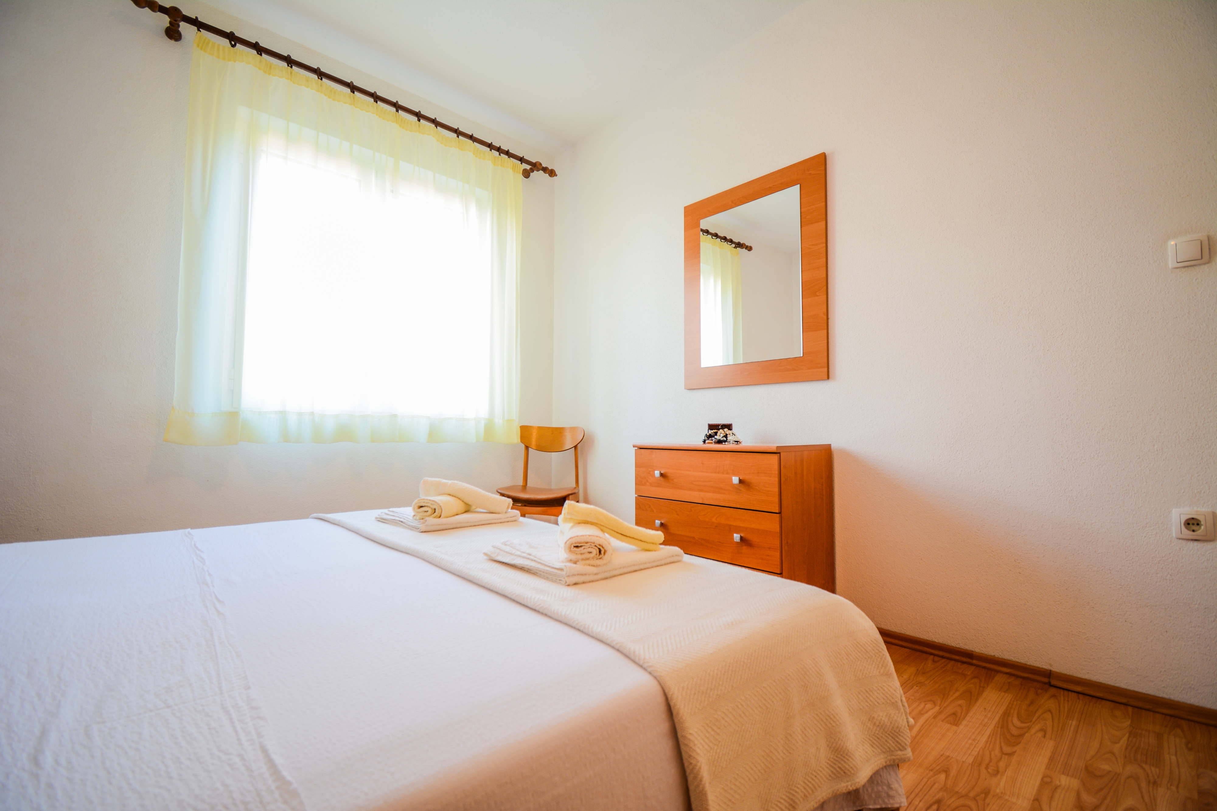 Apartament może przyjąć 4 gości. Łóżka znajdują się w sypialniach, których jest 2, na powierzchni 56m2. Goście mają dostęp do tarasu, by korzystać z ciepłych, letnich wieczorów. Możliwość przygotowywania posiłków poprzez korzystanie ze wspólnego grilla. W kwaterze dozwolony jest pobyt zwierzęcia domowego, za dopłatą. WLICZONE W CENĘ: taksa pobytowa, sprzątanie końcowe, klimatyzacja, parking, internet, żelazko, deska do prasowania, suszarka do włosów. NIEOBOWIĄZKOWE KOSZTY DODATKOWE: zwierzęta domowe (7,00 € za nocleg), 1 łóżeczko dziecięce (10,00 € osobadzień). Dostępność dodatkowych usług w rezerwowanym terminie oraz ich cenę (jeśli nie jest podana) należy sprawdzić wcześniej. Za dodatowe usługi, które nie zostały uwzględnione w kalkulacji ceny, płaci się bezpośrednio właścicielowi obiektu, pod warunkiem śe gość korzysta z tych usług.