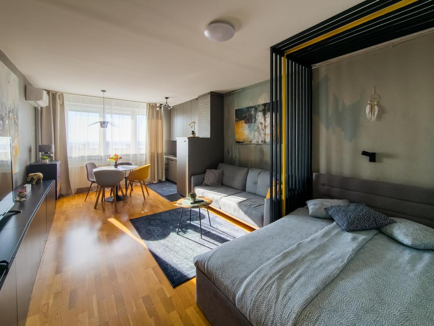 Apartament typu studio. This air-conditioned apartment consists of 1 living room, 1 separate bedroom and 1 bathroom with a bath. Guests can make meals in the kitchen that is equipped with a stovetop, a refrigerator, a dishwasher and kitchenware. The apartment provides a washing machine, soundproof walls, a tea and coffee maker, a flat-screen TV, as well as city views. The unit offers 2 beds. Apartament - 4 osobowy. Powierzchnia pokoju ok.: 40 mkw.