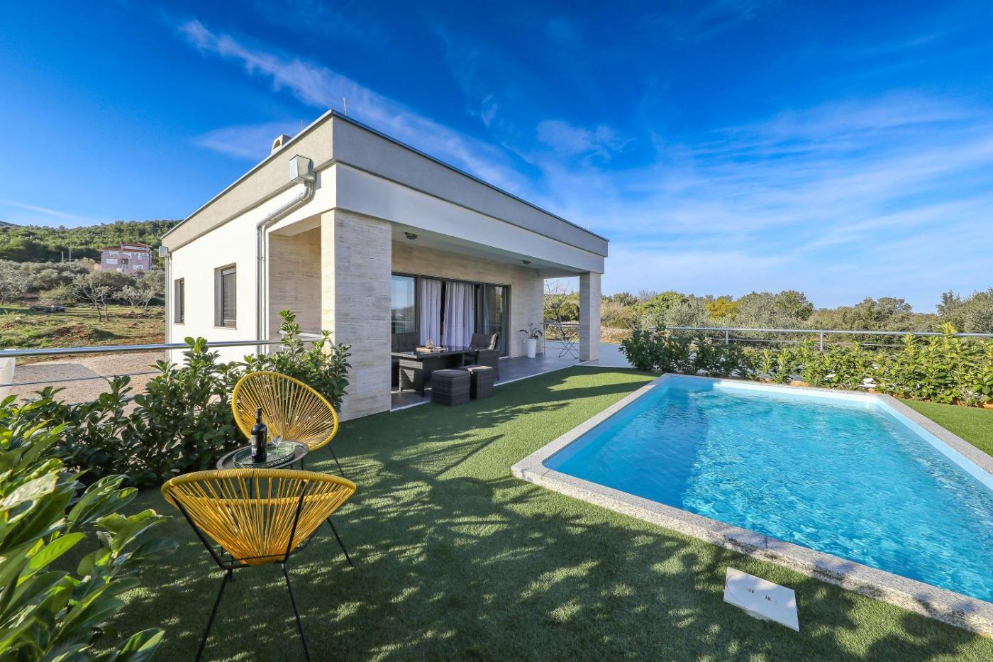 Dom z 2 sypialniami. The private pool is the special feature of this holiday home. Featuring a private entrance, this air-conditioned holiday home comprises 1 living room, 2 separate bedrooms and 2 bathrooms with a walk-in shower and a hairdryer. Guests will find a refrigerator, a dishwasher, kitchenware and an oven in the fully equipped kitchen. The holiday home also provides guests with a barbecue. Boasting a terrace with sea views, this holiday home also provides a washing machine and a flat-screen TV with cable channels. The unit offers 3 beds. Dom wakacyjny - 5 osobowy. Powierzchnia pokoju ok.: 79 mkw.